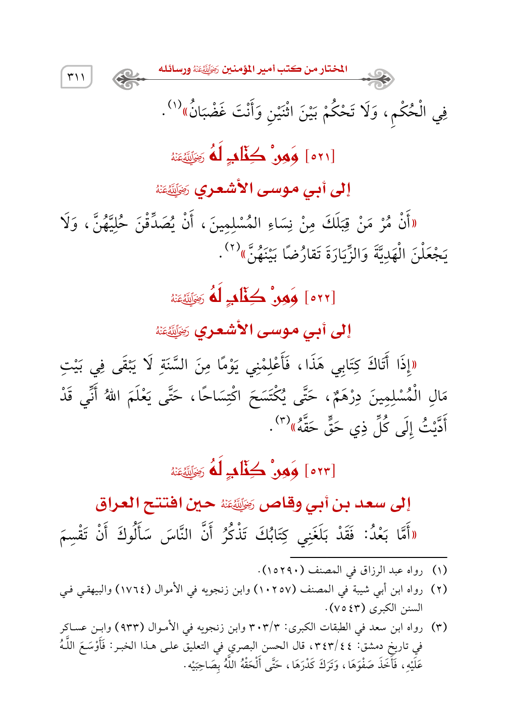 (¬3) رواه ابن سعد في الطبقات الكبرى: 3/ 303 وابن زنجويه في الأموال (933) وابن عساكر في تاريخ دمشق: 44/ 343، قال الحسن البصري في التعليق على هذا الخبر: فَأَوْسَعَ اللَّهُ عَلَيْهِ، فَأَخَذَ صَفْوَهَا، وَتَرَكَ كَدْرَهَا، حَتَّى أَلْحَقْهُ اللَّهُ بِصَاحِبَيْه.