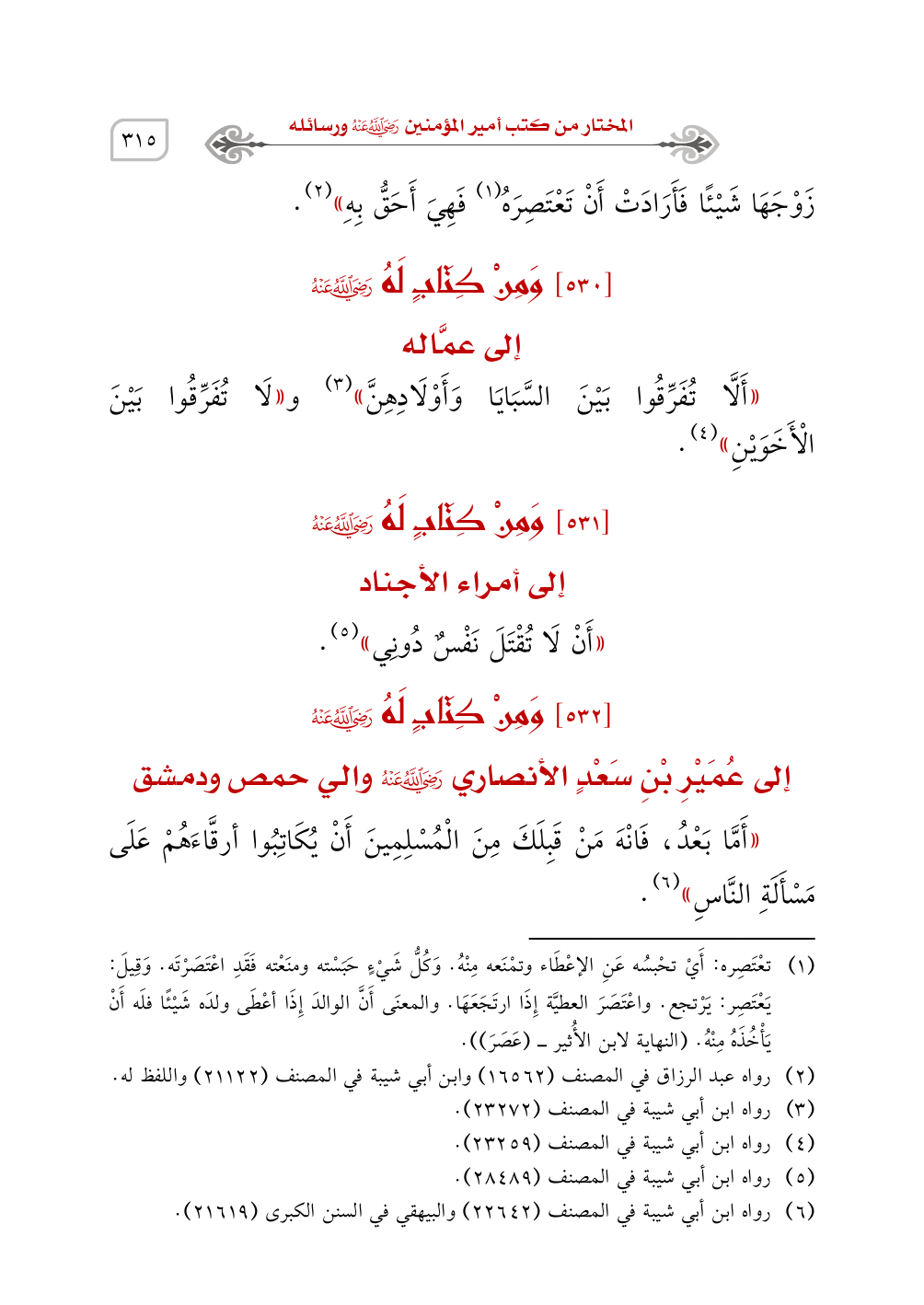 ((أَمَّا بَعْدُ، فَانْهَ مَنْ قَبِلَكَ مِنَ الْمُسْلِمِينَ أَنْ يُكَاتِبُوا أرقَّاءَهُمْ عَلَى مَسْأَلَةِ النَّاسِ)) (¬6).