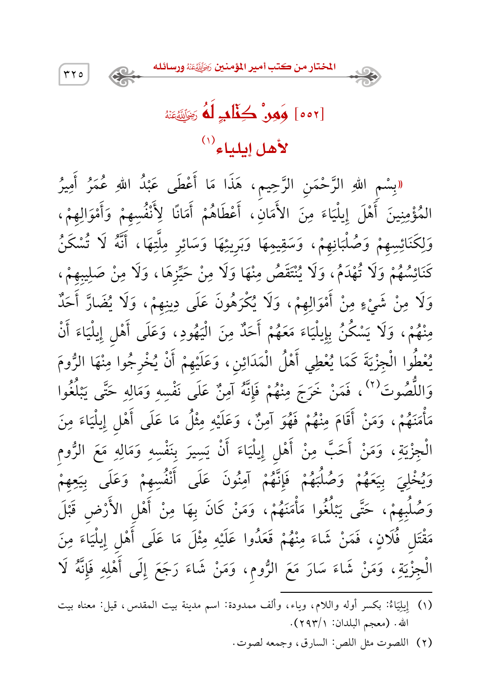 ((بِسْمِ اللهِ الرَّحْمَنِ الرَّحِيمِ، هَذَا مَا أَعْطَى عَبْدُ اللهِ عُمَرُ أَمِيرُ المُؤْمِنِينَ أَهْلَ إِيلْيَاءَ مِنَ الأَمَانِ، أَعْطَاهُمْ أَمَانًا لِأَنْفُسِهِمْ وَأَمْوَالِهِمْ، وَلِكَنَائِسِهِمْ وَصُلْبَانِهِمْ، وَسَقِيمِهَا وَبَرِيئِهَا وَسَائِرِ مِلَّتِهَا، أَنَّهُ لَا تُسْكَنُ كَنَائِسُهُمْ وَلَا تُهْدَمُ، وَلَا يُنْتَقَصُ مِنْهَا وَلَا مِنْ حَيِّزِهَا، وَلَا مِنْ صَلِيبِهِمْ، وَلَا مِنْ شَيْءٍ مِنْ أَمْوَالِهِمْ، وَلَا يُكْرَهُونَ عَلَى دِينِهِمْ، وَلَا يُضَارَّ أَحَدٌ مِنْهُمْ، وَلَا يَسْكُنُ بِإِيلْيَاءَ مَعَهُمْ أَحَدٌ مِنَ الْيَهُودِ، وَعَلَى أَهْلِ إِيلْيَاءَ أَنْ يُعْطُوا الْجِزْيَةَ كَمَا يُعْطِي أَهْلُ الْمَدَائِنِ، وَعَلَيْهِمْ أَنْ يُخْرِجُوا مِنْهَا الرُّومَ وَاللُّصُوتَ (¬2)،