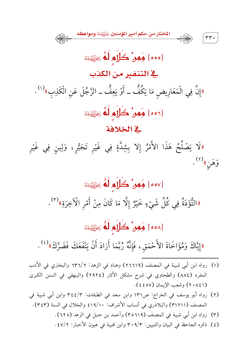 (¬2) رواه أبو يوسف في الخراج: ص131 وابن سعد في الطبقات: 3/ 344 وابن أبي شيبة في المصنف (31211) والبلاذري في أنساب الأشراف: 10/ 419 والخلال في السنة (343).