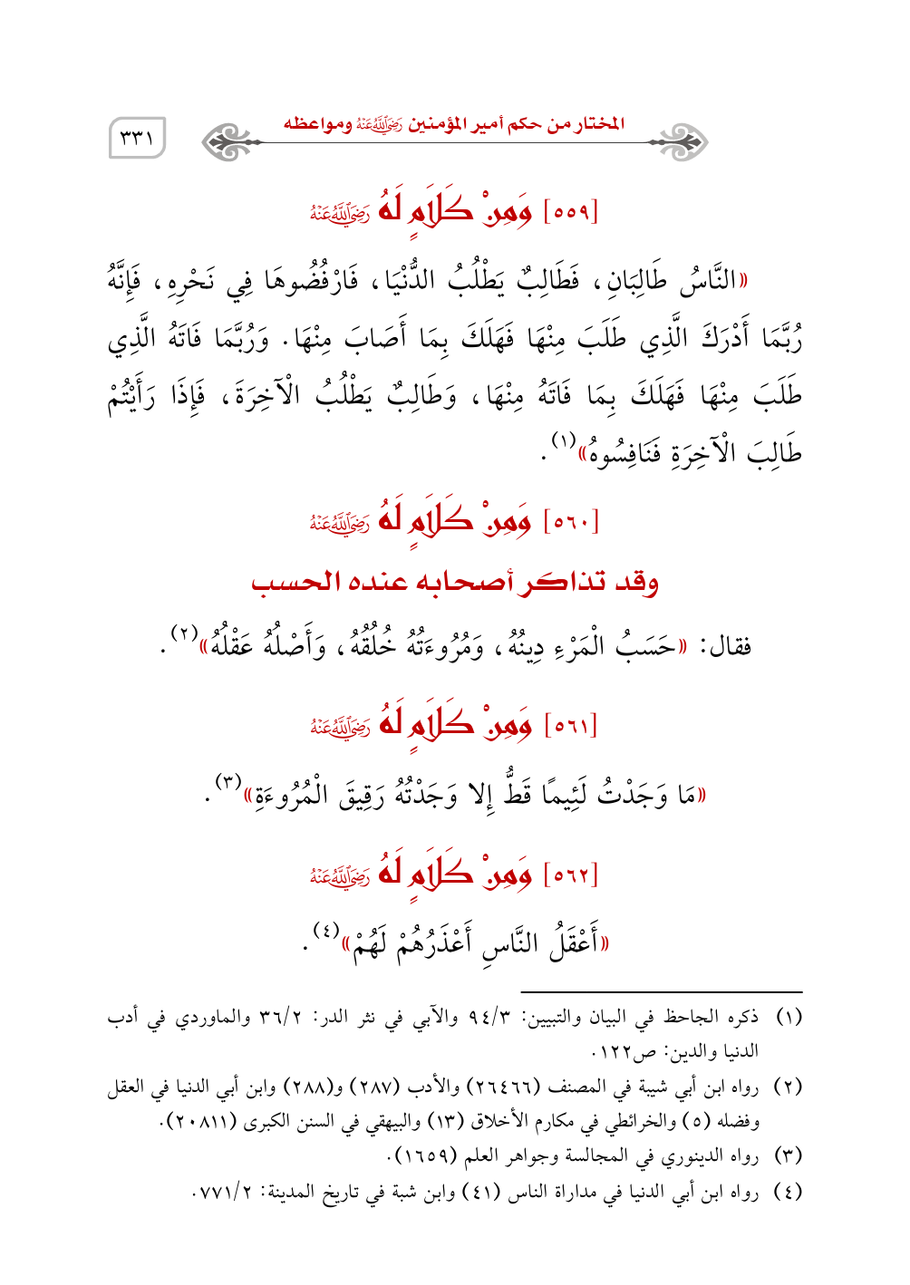 (¬1) ذكره الجاحظ في البيان والتبيين: 3/ 94 والآبي في نثر الدر: 2/ 36 والماوردي في أدب الدنيا والدين: ص122.