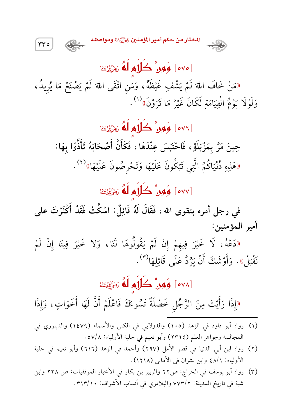 (¬3) رواه أبو يوسف في الخراج: ص22 والزبير بن بكار في الأخبار الموفقيات: ص 228 وابن شبة في تاريخ المدينة: 2/ 773 والبلاذري في أنساب الأشراف: 10/ 313.