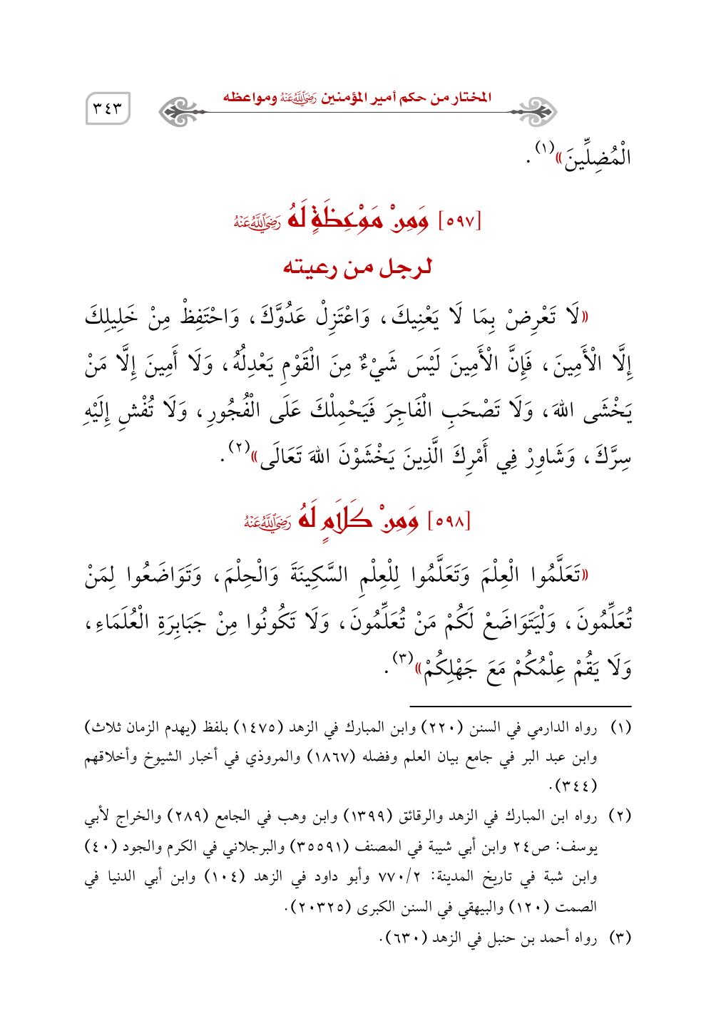 (¬2) رواه ابن المبارك في الزهد والرقائق (1399) وابن وهب في الجامع (289) والخراج لأبي يوسف: ص24 وابن أبي شيبة في المصنف (35591) والبرجلاني في الكرم والجود (40) وابن شبة في تاريخ المدينة: 2/ 770 وأبو داود في الزهد (104) وابن أبي الدنيا في الصمت (120) والبيهقي في السنن الكبرى (20325).