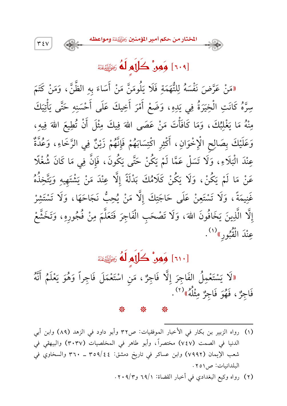 (¬1) رواه الزبير بن بكار في الأخبار الموفقيات: ص32 وأبو داود في الزهد (89) وابن أبي الدنيا في الصمت (747) مختصراً، وأبو طاهر في المخلصيات (3037) والبيهقي في شعب الإيمان (7992) وابن عساكر في تاريخ دمشق: 44/ 359 - 360 والسخاوي في البلدانيات: ص251.