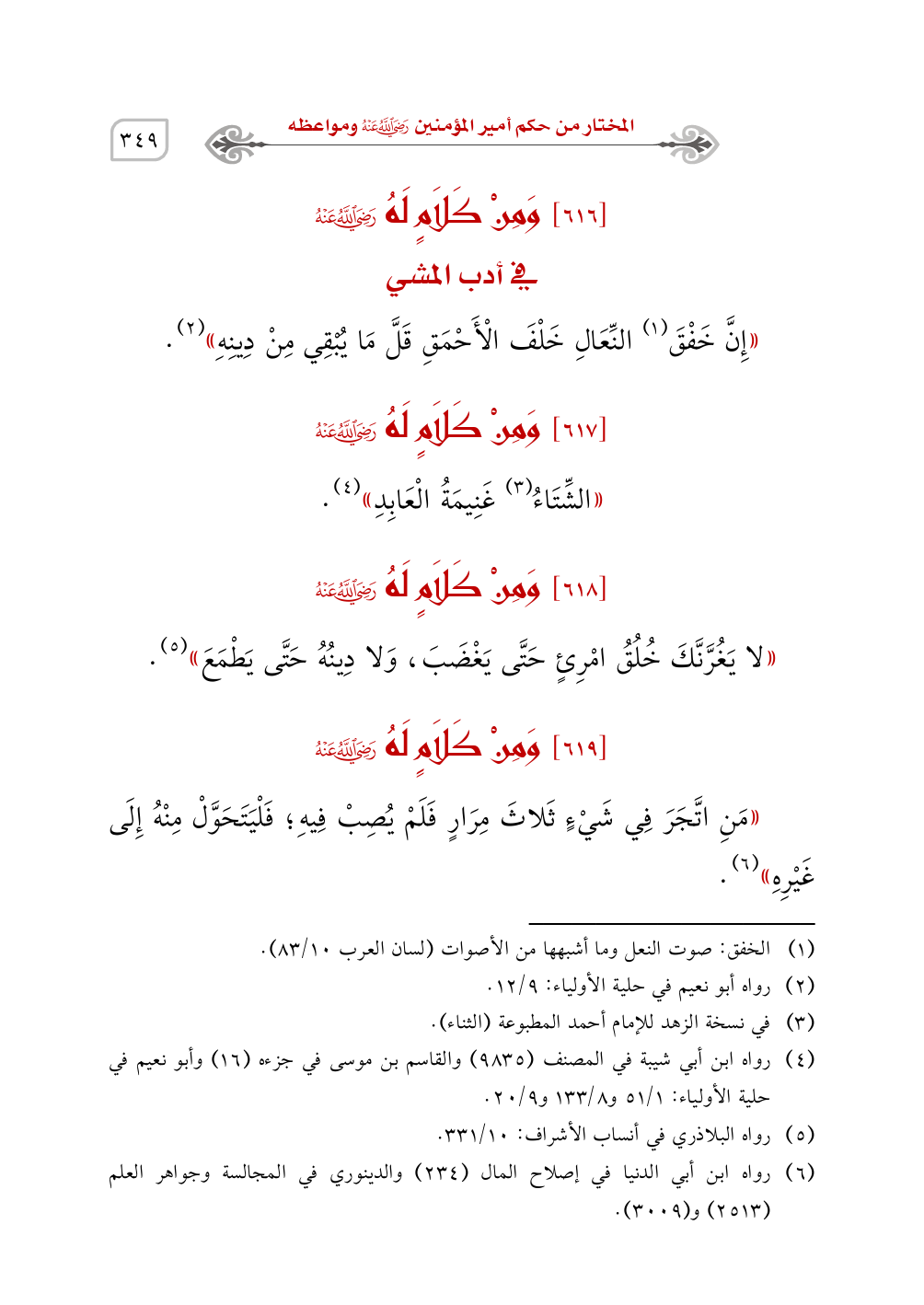 (¬6) رواه ابن أبي الدنيا في إصلاح المال (234) والدينوري في المجالسة وجواهر العلم (2513) و (3009).