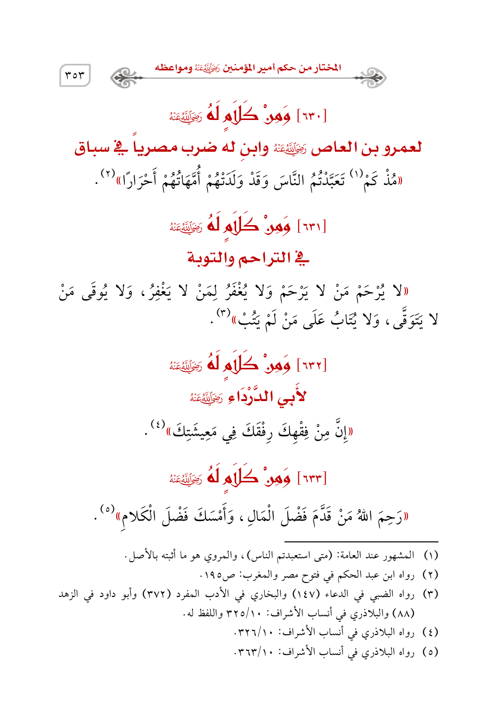 (¬1) المشهور عند العامة: (متى استعبدتم الناس)، والمروي هو ما أثبته بالأصل.