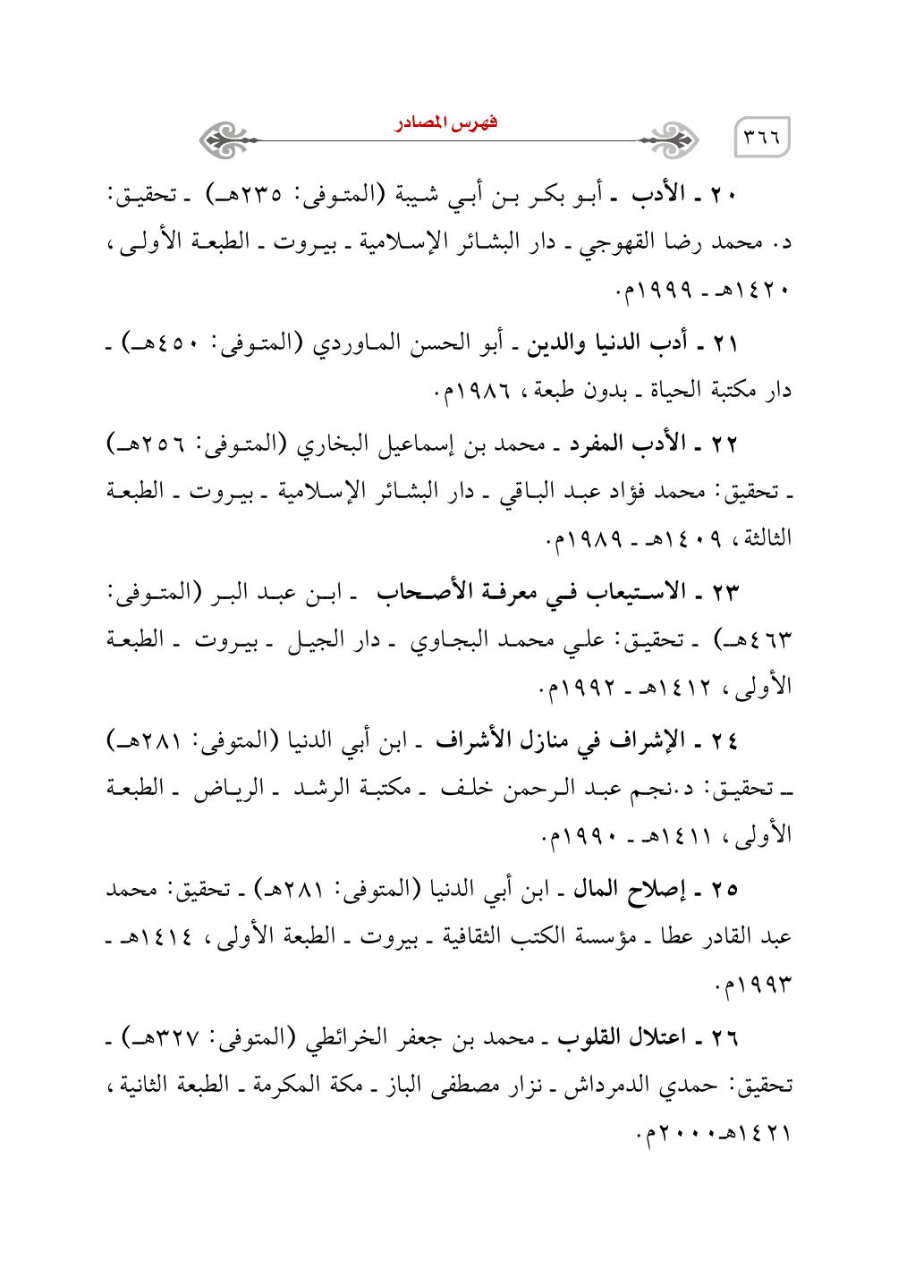 24 - الإشراف في منازل الأشراف - ابن أبي الدنيا (المتوفى: 281هـ) - تحقيق: د. نجم عبد الرحمن خلف - مكتبة الرشد - الرياض - الطبعة الأولى، 1411هـ - 1990م.