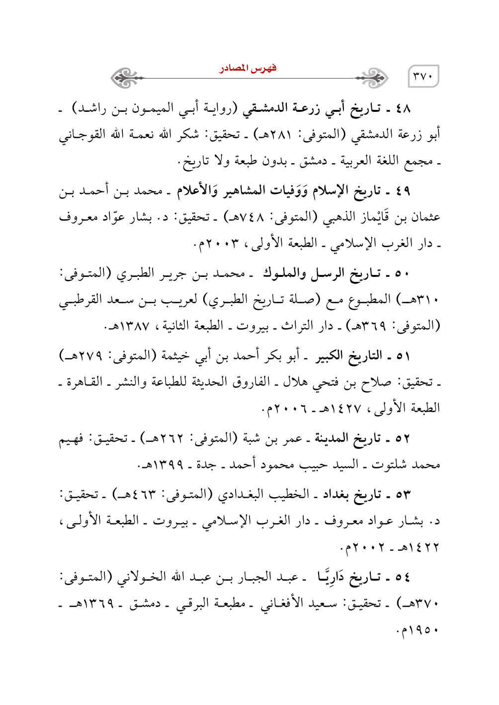 48 - تاريخ أبي زرعة الدمشقي (رواية أبي الميمون بن راشد) - أبو زرعة الدمشقي (المتوفى: 281هـ) - تحقيق: شكر الله نعمة الله القوجاني - مجمع اللغة العربية - دمشق - بدون طبعة ولا تاريخ.