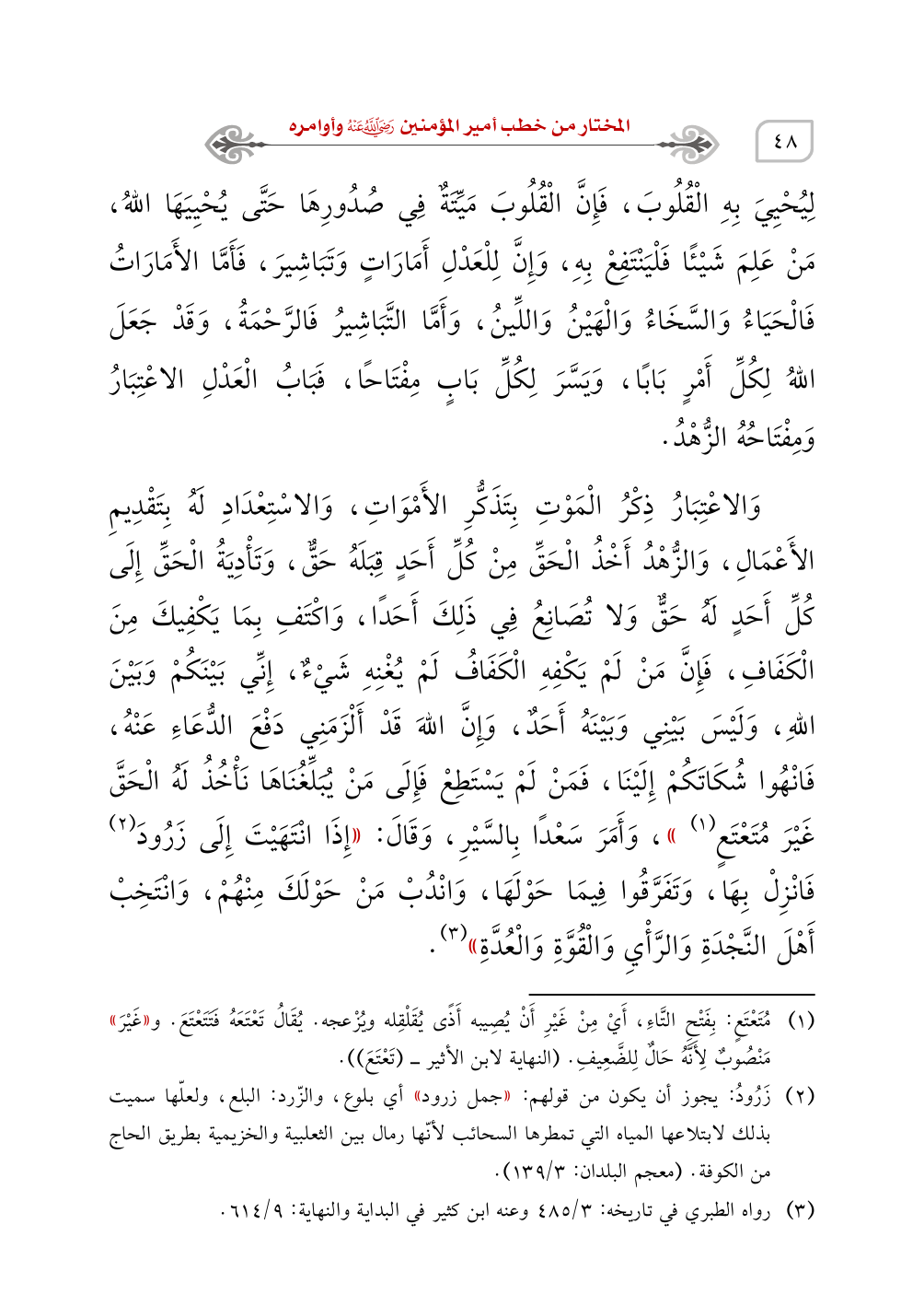وَالاعْتِبَارُ ذِكْرُ الْمَوْتِ بِتَذَكُّرِ الأَمْوَاتِ، وَالاسْتِعْدَادِ لَهُ بِتَقْدِيمِ الأَعْمَالِ، وَالزُّهْدُ أَخْذُ الْحَقِّ مِنْ كُلِّ أَحَدٍ قِبَلَهُ حَقٌّ، وَتَادِيَةُ الْحَقِّ إِلَى كُلِّ أَحَدٍ لَهُ حَقٌّ وَلا تُصَانِعُ فِي ذَلِكَ أَحَدًا، وَاكْتَفِ بِمَا يَكْفِيكَ مِنَ الْكَفَافِ، فَإِنَّ مَنْ لَمْ يَكْفِهِ الْكَفَافُ لَمْ يُغْنِهِ شَيْءٌ، إِنِّي بَيْنَكُمْ وَبَيْنَ اللهِ، وَلَيْسَ بَيْنِي وَبَيْنَهُ أَحَدٌ، وَإِنَّ اللهَ قَدْ أَلْزَمَنِي دَفْعَ الدُّعَاءِ عَنْهُ، فَانْهُوا شُكَاتَكُمْ إِلَيْنَا، فَمَنْ لَمْ يَسْتَطِعْ فَإِلَى مَنْ يُبَلِّغُنَاهَا نَاخُذُ لَهُ الْحَقَّ غَيْرَ مُتَعْتَعٍ (¬1)))، وَأَمَرَ سَعْدًا بِالسَّيْرِ، وَقَالَ: ((إِذَا انْتَهَيْتَ إِلَى زَرُودَ (¬2) فَانْزِلْ بِهَا، وَتَفَرَّقُوا فِيمَا حَوْلَهَا، وَانْدُبْ مَنْ حَوْلَكَ مِنْهُمْ، وَانْتَخِبْ أَهْلَ النَّجْدَةِ وَالرَّايِ وَالْقُوَّةِ وَالْعُدَّةِ)) (¬3).
