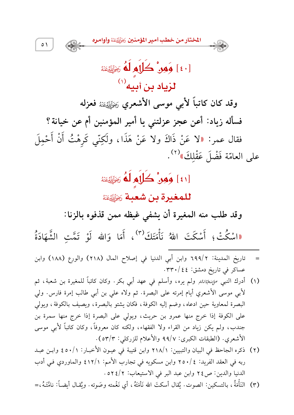 (¬2) ذكره الجاحظ في البيان والتبيين: 1/ 218 وابن قتيبة في عيون الأخبار: 1/ 450 وابن عبد ربه في العقد الفريد: 4/ 250 وابن مسكويه في تجارب الأمم: 1/ 412 والماوردي في أدب الدنيا والدين: ص24 وابن عبد البر في الاستيعاب: 2/ 524.