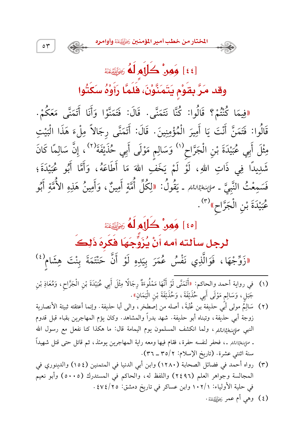 (¬1) في رواية أحمد والحاكم: ((أَتَمَنَّى لَوْ أَنَّهَا مَمْلُوءَةٌ رِجَالًا مِثْلَ أَبِي عُبَيْدَةَ بْنِ الْجَرَّاحِ، وَمُعَاذِ بْنِ جَبَلٍ، وَسَالِمٍ مَوْلَى أَبِي حُذَيْفَةَ، وَحُذَيْفَةَ بْنِ الْيَمَانِ)).