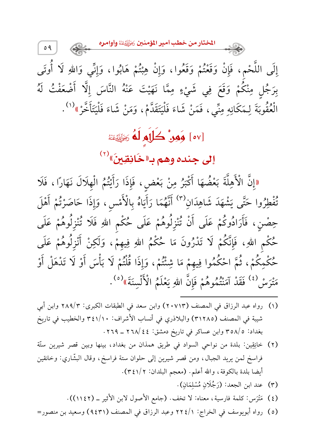 (¬1) رواه عبد الرزاق في المصنف (20713) وابن سعد في الطبقات الكبرى: 3/ 289 وابن أبي شيبة في المصنف (31285) والبلاذري في أنساب الأشراف: 10/ 341 والخطيب في تاريخ بغداد: 5/ 358 وابن عساكر في تاريخ دمشق: 44/ 268 - 269.