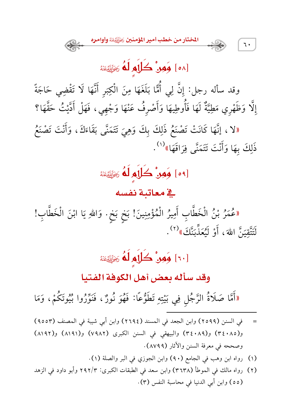(¬2) رواه مالك في الموطأ (3638) وابن سعد في الطبقات الكبرى: 3/ 292 وأبو داود في الزهد (55) وابن أبي الدنيا في محاسبة النفس (3).
