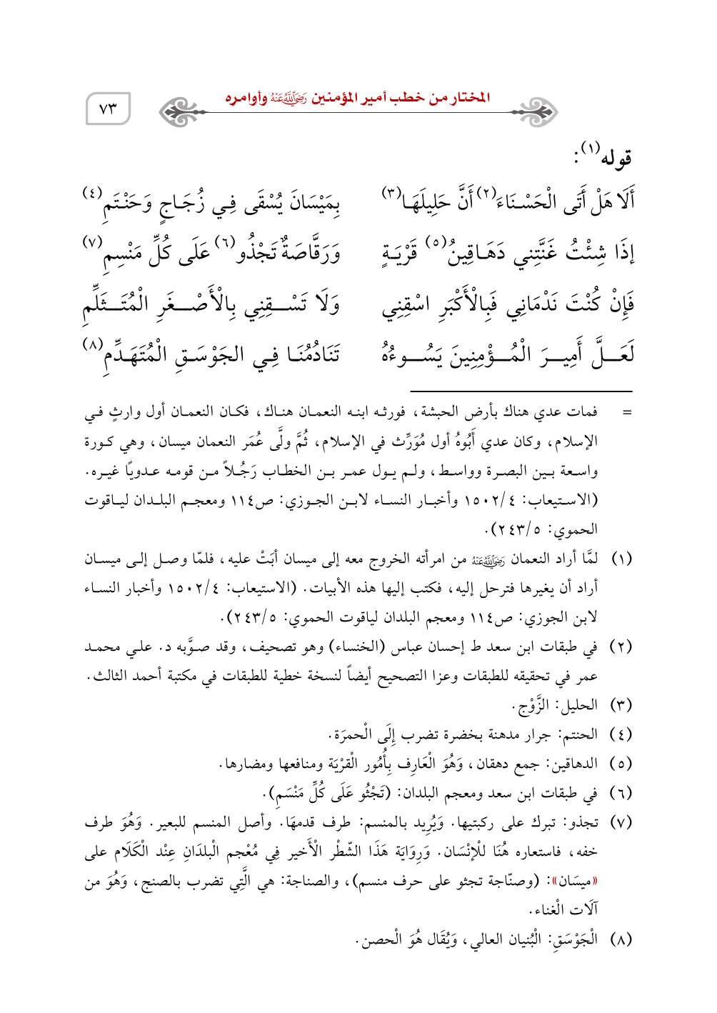 (¬7) تجذو: تبرك على ركبتيها. وَيُرِيد بالمنسم: طرف قدمهَا. وأصل المنسم للبعير. وَهُوَ طرف خفه، فاستعاره هُنَا للْإنْسَان. وَرِوَايَة هَذَا الشّطْر الْأَخير فِي مُعْجم الْبلدَانِ عِنْد الْكَلَام على ((ميسَان)): (وصنّاجة تجثو على حرف منسم)، والصناجة: هي الَّتِي تضرب بالصنج، وَهُوَ من آلَات الْغناء.