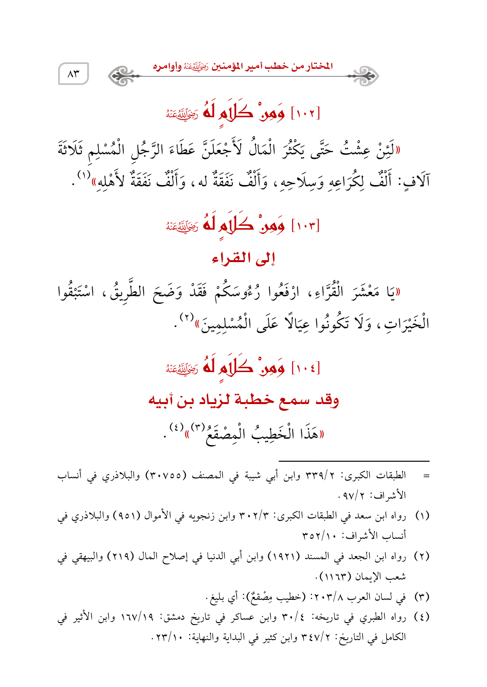 = الطبقات الكبرى: 2/ 339 وابن أبي شيبة في المصنف (30755) والبلاذري في أنساب الأشراف: 2/ 97.