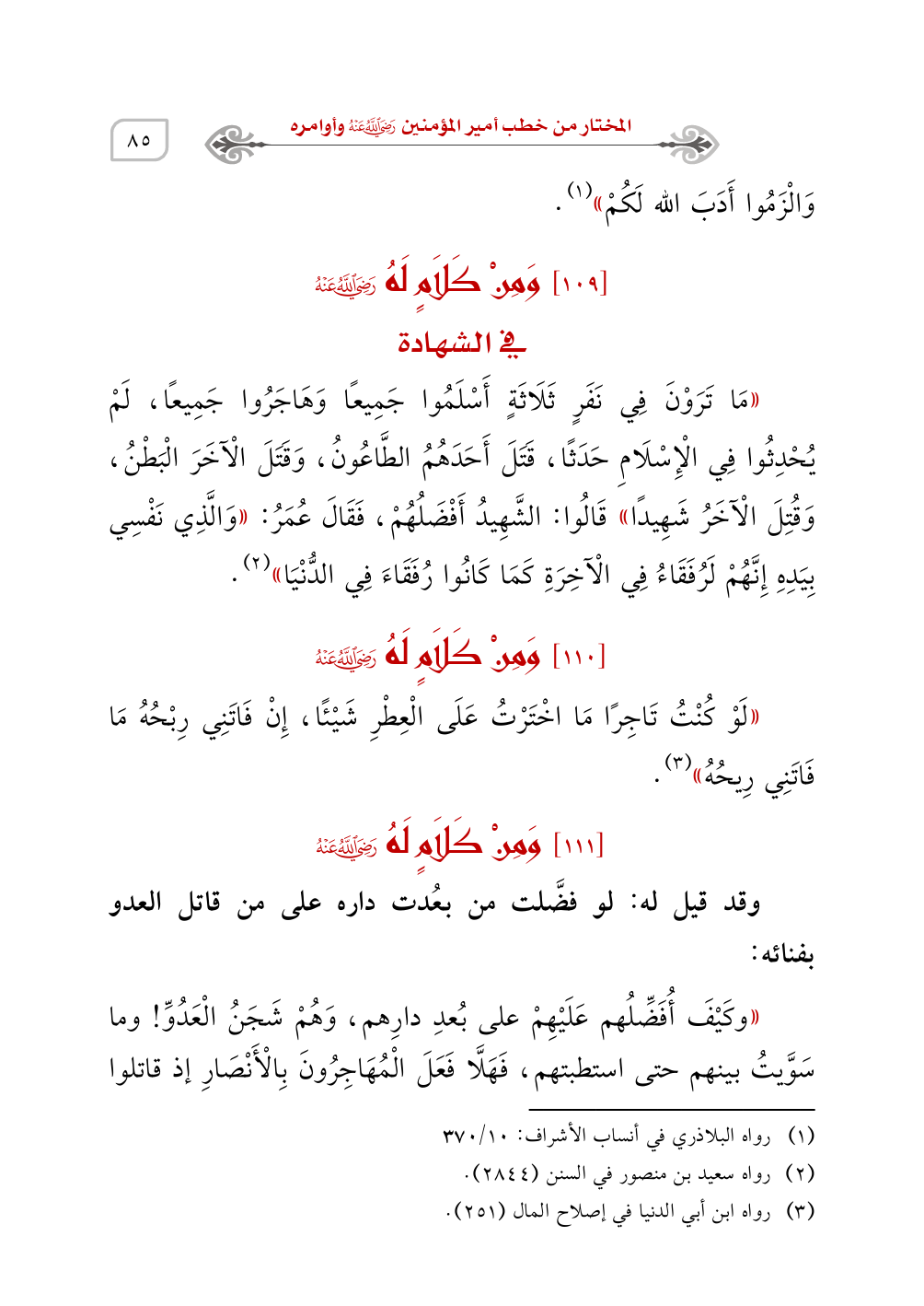 ((وكَيْفَ أُفَضِّلُهم عَلَيْهِمْ على بُعدِ دارِهم، وَهُمْ شَجَنُ الْعَدُوِّ! وما سَوَّيتُ بينهم حتى استطبتهم، فَهَلَّا فَعَلَ الْمُهَاجِرُونَ بِالْأَنْصَارِ إذ قاتلوا