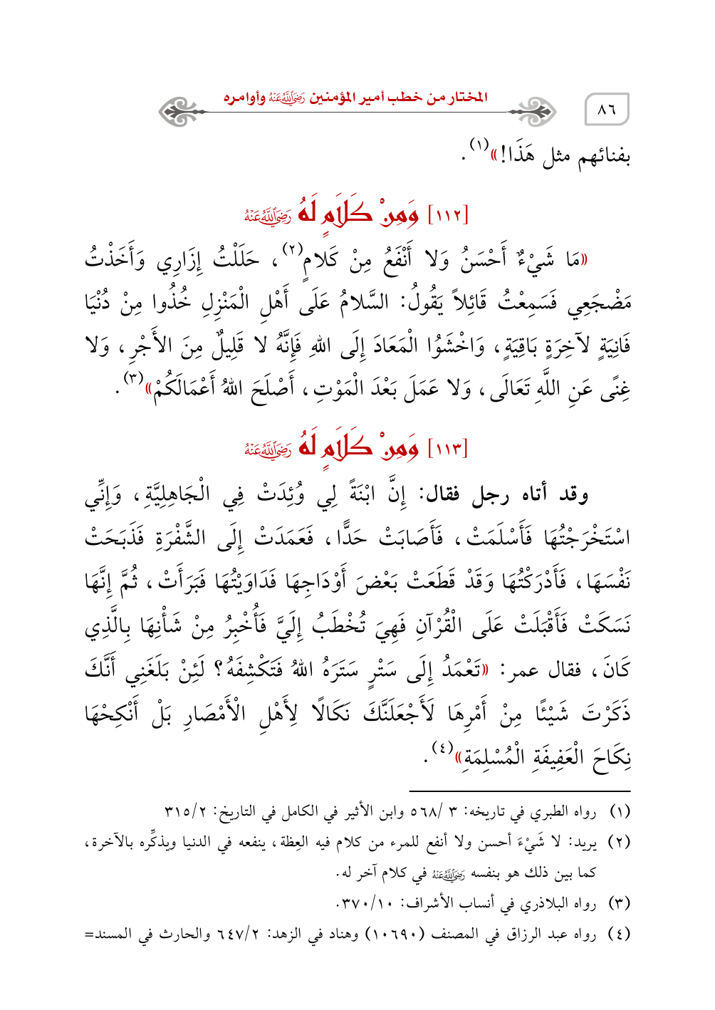 (¬2) يريد: لا شَيْءَ أحسن ولا أنفع للمرء من كلام فيه العِظة، ينفعه في الدنيا ويذكِّره بالآخرة، كما بين ذلك هو بنفسه - رَضِيَ اللَّهُ عَنْهُ - في كلام آخر له.
