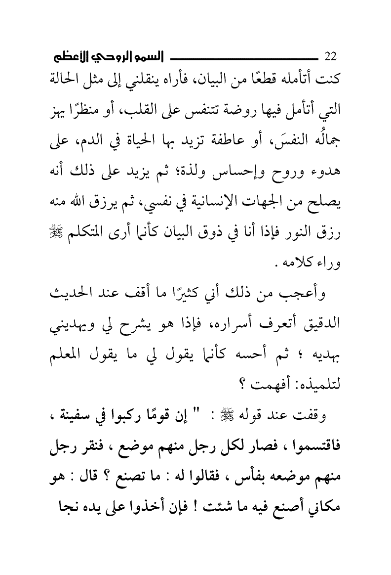 وأعجب من ذلك أني كثيرًا ما أقف عند الحديث الدقيق أتعرف أسراره، فإذا هو يشرح لي ويهديني بهديه؛ ثم أُحِسُّه كأنما يقول لي ما يقول المعلم لتلميذه: ((أفهمت؟)).