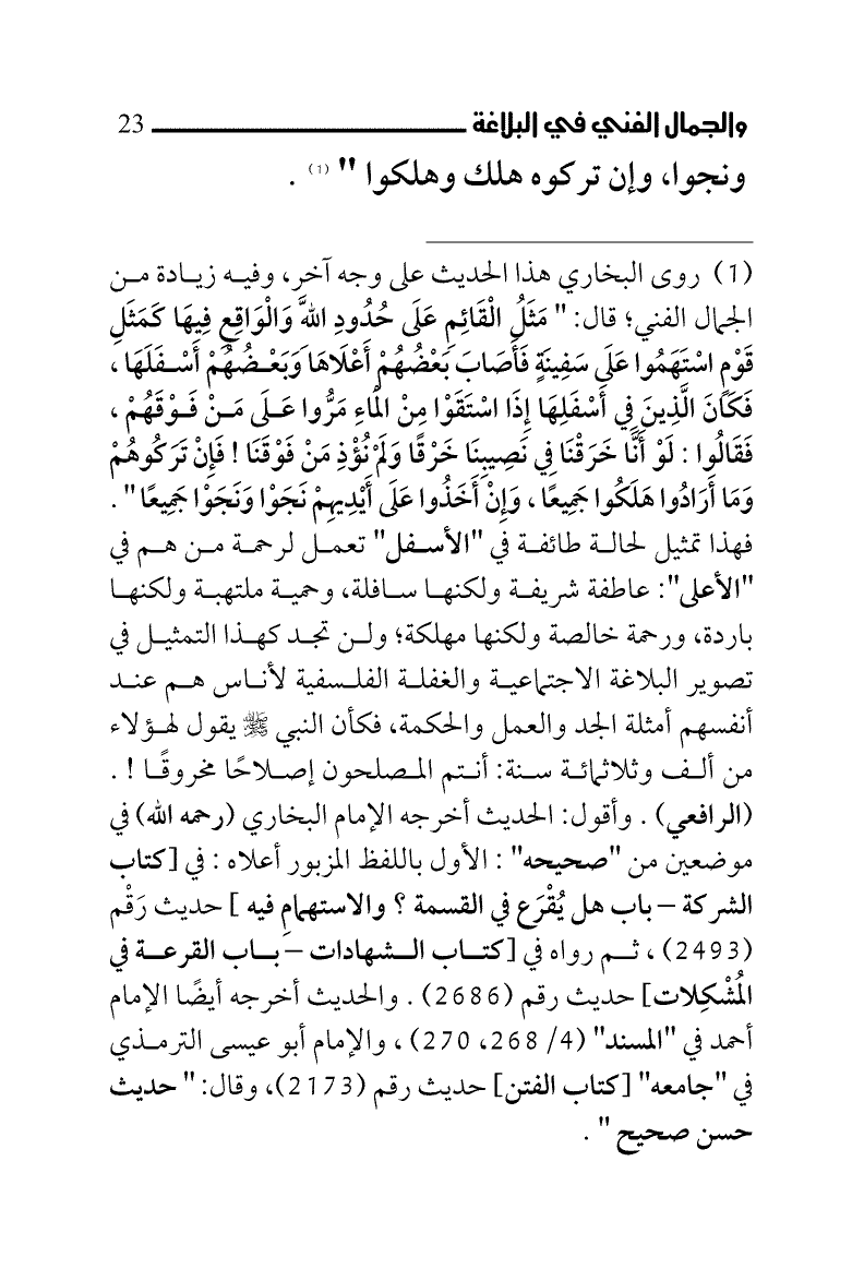 (¬1) روى البخاريُّ هذا الحديثَ على وجهٍ آخرَ، وفيه زيادةٌ من الجمال الفني؛ قال: ((مَثَلُ الْقَائِمِ عَلَى حُدُودِ اللهِ وَالْوَاقِعِ فِيهَا كَمَثَلِ قَوْمٍ اسْتَهَمُوا عَلَى سَفِينَةٍ فَأَصَابَ بَعْضُهُمْ أَعْلاَهَا وَبَعْضُهُمْ أَسْفَلَهَا، فَكَانَ الَّذِينَ فِي أَسْفَلِهَا إِذَا اسْتَقَوْا مِنْ الْمَاءِ مَرُّوا عَلَى مَنْ فَوْقَهُمْ، فَقَالُوا: لَوْ أَنَّا خَرَقْنَا فِي نَصِيبِنَا خَرْقًا وَلَمْ نُؤْذِ مَنْ فَوْقَنَا! فَإِنْ تَرَكُوهُمْ وَمَا أَرَادُوا هَلَكُوا جَمِيعًا، وَإِنْ أَخَذُوا عَلَى أَيْدِيهِمْ نَجَوْا وَنَجَوْا جَمِيعًا)). فهذا تمثيل لحالة طائفة في "الأسفل" تعمل لرحمة من هم في "الأعلى": عاطفة شريفة ولكنها سافلة، وحمية ملتهبة ولكنها باردة، ورحمة خالصة ولكنها مهلكة؛ ولن تجد كهذا التمثيل في تصوير البلاغة الاجتماعية والغفلة الفلسفية لأناس هم عند أنفسهم أمثلة الجِد والعمل والحكمة، فكأن النبي - صلى الله عليه وسلم - يقول لهؤلاء من ألف وثلاثمائة سنة: أنتم المصلحون إصلاحًا مخروقًا!. (الرافعي). وأقول: الحديث أخرجه الإمام البخاري (رحمه الله) في موضعين من "صحيحه": الأول باللفظ المزبور أعلاه: في [كتاب الشركة - باب هل يُقْرَع في القسمة؟ والاستهمامِ فيه] حديث رَقْم (2493)، ثم رواه في [كتاب الشهادات - باب القرعة في المُشْكِلات] حديث رقم (2686). والحديث أخرجه أيضًا الإمام أحمد في "المسند" (4/ 268، 270)، والإمام أبو عيسى الترمذي في "جامعه" [كتاب الفتن] حديث رقم (2173)، وقال: ((حديث حسن صحيح))، والإمام البيهقي في "السنن الكبير" [كتاب العتق - باب إثبات استعمال القرعة] (ج10ص288).
