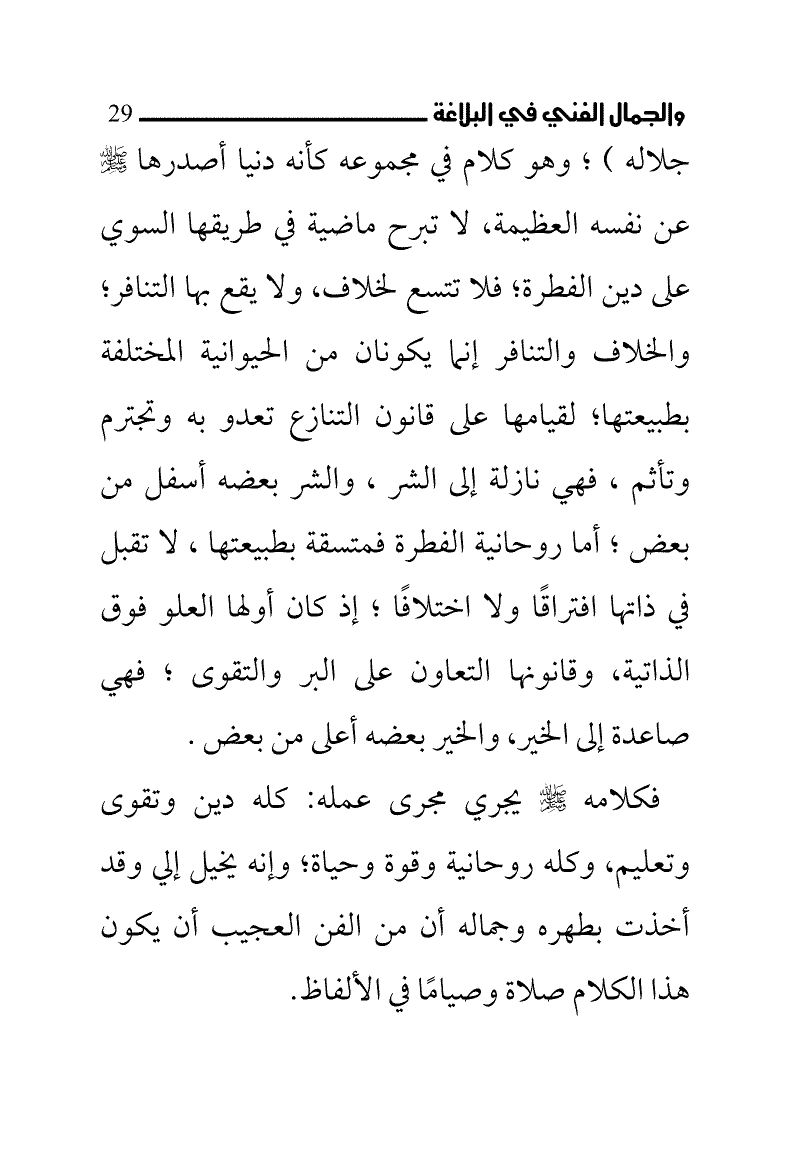 جلاله)؛ وهو كلام في مجموعه كأنه دنيا أصدرها - صلى الله عليه وسلم - عن نفسه العظيمة، لا تبرح ماضية في طريقها السوي على دين الفطرة؛ فلا تتسع لخلاف، ولا يقع بها التنافر؛ والخلاف والتنافر إنما يكونان من الحيوانية المختلفة بطبيعتها؛ لقيامها على قانون التنازع تعدو به وتجترم وتأثم، فهي نازلة إلى الشر، والشر بعضه أسفل من بعض؛ أما روحانية الفطرة فمتسقة بطبيعتها، لا تقبل في ذاتها افتراقًا ولا اختلافًا؛ إذ كان أولها العلو فوق الذاتية، وقانونها التعاون على البر والتقوى؛ فهي صاعدة إلى الخير، والخير بعضه أعلى من بعض.