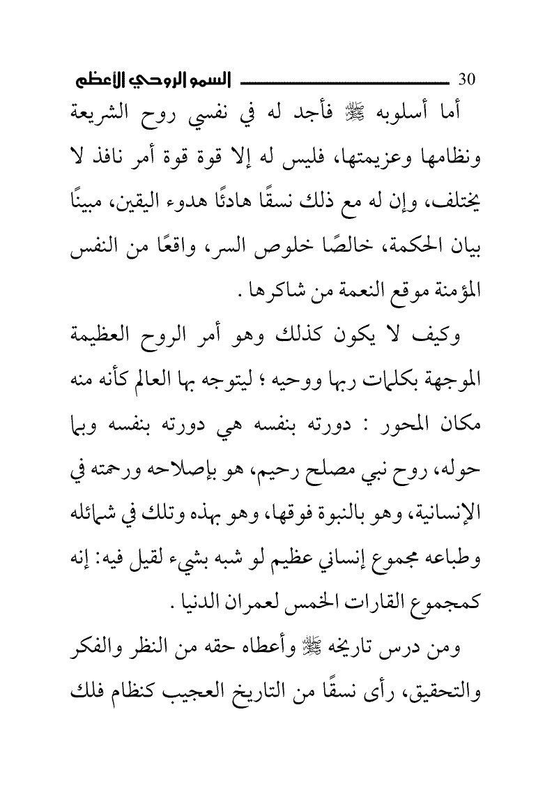 وكيف لا يكون كذلك وهو أمر الروح العظيمة الموجهة بكلمات ربها ووحيه؛ ليتوجه بها العالم كأنه منه مكان المحور: دورته بنفسه هي دورته بنفسه وبما حوله، روح نبي مصلح رحيم، هو بإصلاحه ورحمته في الإنسانية، وهو بالنبوة فوقها، وهو بهذه وتلك في شمائله وطباعه مجموع إنساني عظيم لو شبه بشيء لقيل فيه: إنه كمجموع القارات الخمس لعمران الدنيا.