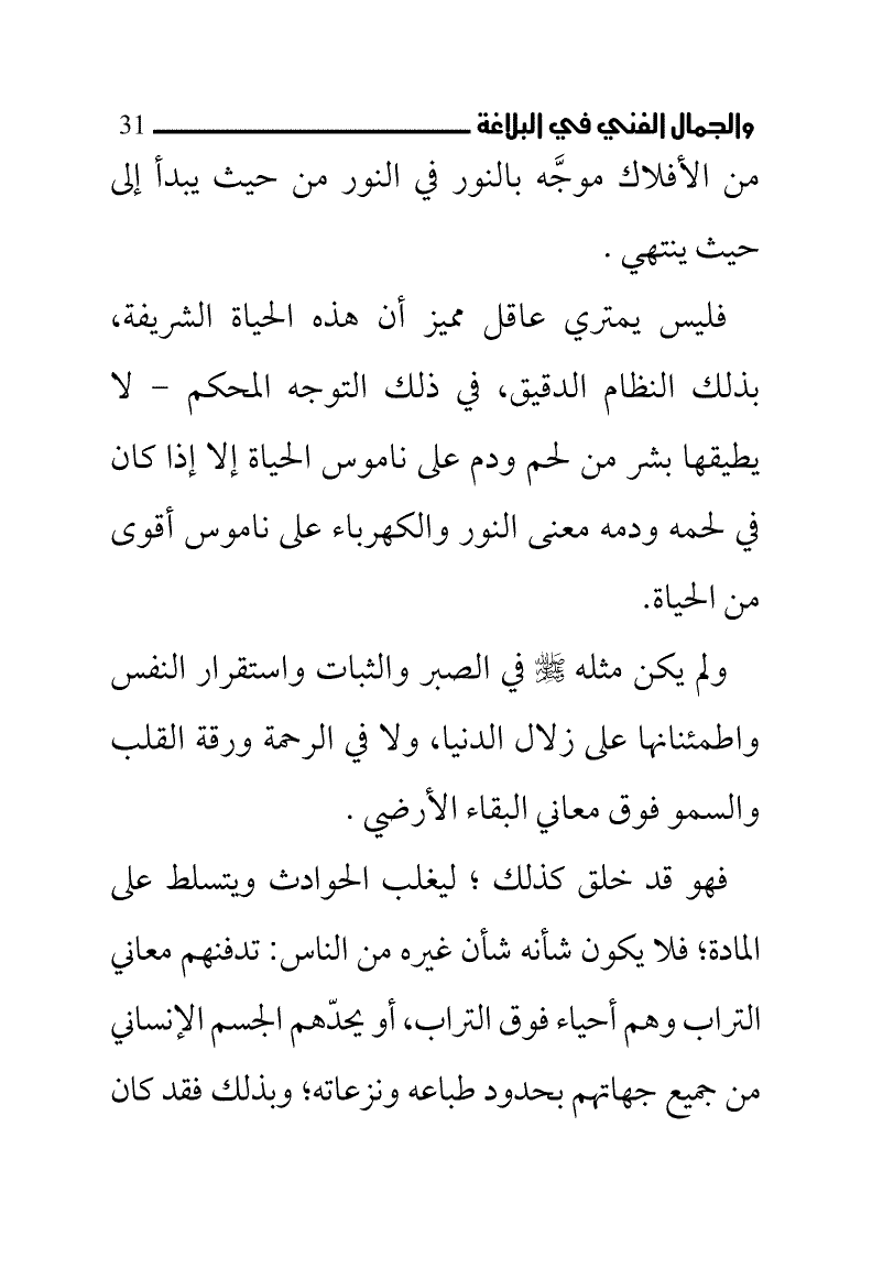 فليس يمتري عاقل مميز أن هذه الحياة الشريفة، بذلك النظام الدقيق، في ذلك التوجه المحكم - لا يطيقها بشر من لحم ودم على ناموس الحياة إلا إذا كان في لحمه ودمه معنى النور والكهرباء على ناموس أقوى من الحياة.