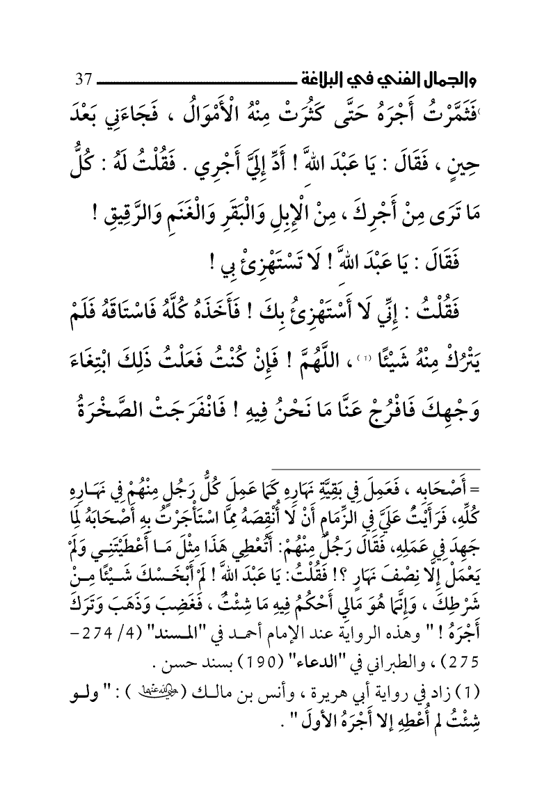 فَثَمَّرْتُ أَجْرَهُ حَتَّى كَثُرَتْ مِنْهُ الْأَمْوَالُ، فَجَاءَنِي بَعْدَ حِينٍ، فَقَالَ: يَا عَبْدَ اللهِ! أَدِّ إِلَيَّ أَجْرِي. فَقُلْتُ لَهُ: كُلُّ مَا تَرَى مِنْ أَجْرِكَ، مِنْ الْإِبِلِ وَالْبَقَرِ وَالْغَنَمِ وَالرَّقِيقِ! فَقَالَ: يَا عَبْدَ اللهِ! لاَ تَسْتَهْزِئْ بِي! فَقُلْتُ: إِنِّي لاَ أَسْتَهْزِئُ بِكَ! فَأَخَذَهُ كُلَّهُ فَاسْتَاقَهُ فَلَمْ يَتْرُكْ مِنْهُ شَيْئًا (¬1)، اللَّهُمَّ! فَإِنْ كُنْتُ فَعَلْتُ ذَلِكَ ابْتِغَاءَ وَجْهِكَ فَافْرُجْ عَنَّا مَا نَحْنُ فِيهِ! فَانْفَرَجَتْ الصَّخْرَةُ