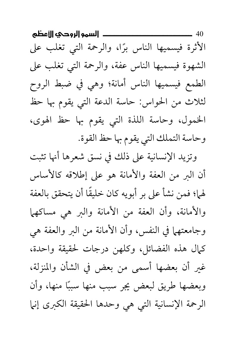 الأثرة فيسميها الناس بِرًّا، والرحمة التي تغلب على الشهوة فيسميها الناس عفةً، والرحمة التي تغلب على الطمع فيسميها الناس أمانةً؛ وهي في ضبط الروح لثلاث من الحواس: حاسة الدعة التي يقوم بها حظ الخمول، وحاسة اللذة التي يقوم بها حظ الهوى، وحاسة التملك التي يقوم بها حظ القوة.