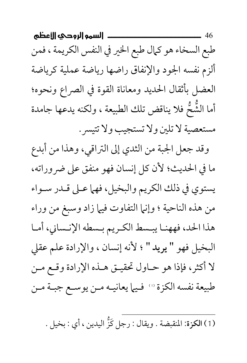 طبع السخاء هو كمال طبع الخير في النفس الكريمة، فمن ألزم نفسه الجود والإنفاق راضها رياضة عملية كرياضة العضل بأثقال الحديد ومعاناة القوة في الصراع ونحوه؛ أما الشُّحُّ فلا يناقض تلك الطبيعة، ولكنه يدعها جامدة مستعصية لا تلين ولا تستجيب ولا تتيسر.