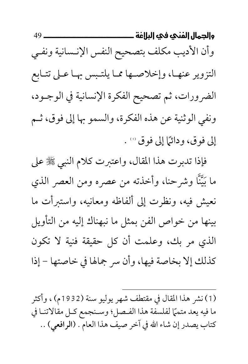 (¬1) نشر هذا المقال في مقتطف شهر يوليو سنة (1932م)، وأكثر ما فيه يعد متممًا لفلسفة هذا الفصل؛ وسنجمع كل مقالاتنا في كتاب يصدر إن شاء الله في آخر صيف هذا العام. (الرافعي). وأقول: المقال المومى إليه عنوانه: "الأدب والأديب"، وهو منشور في الجزء الثالث من "وحي القلم"، وإخال أنه الكتاب الذي عناه الرافعي (رحمه الله). وقال العريان: ((أحسبه كان يعني كتابه "قول معروف"، وقد استغنى عنه بـ "وحي القلم")).