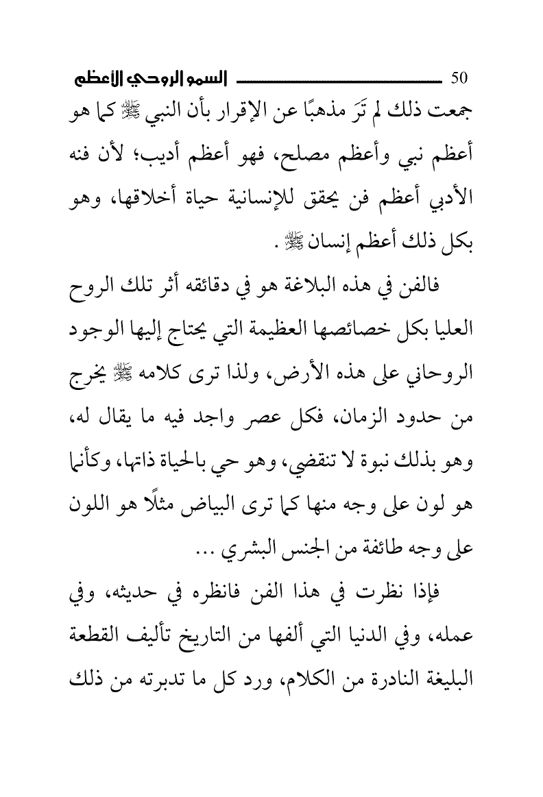 جمعت ذلك لم تَرَ مذهبًا عن الإقرار بأن النبي - صلى الله عليه وسلم - كما هو أعظم نبي وأعظم مصلح، فهو أعظم أديب؛ لأن فنه الأدبي أعظم فن يحقق للإنسانية حياة أخلاقها، وهو بكل ذلك أعظم إنسان - صلى الله عليه وسلم -.