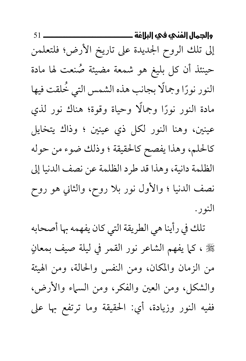 تلك في رأينا هي الطريقة التي كان يفهمه بها أصحابه - صلى الله عليه وسلم -، كما يفهم الشاعر نور القمر في ليلة صيف بمعانٍ من الزمان والمكان، ومن النفس والحالة، ومن الهيئة والشكل، ومن العين والفكر، ومن السماء والأرض، ففيه النور وزيادة، أي: الحقيقة وما ترتفع بها على
