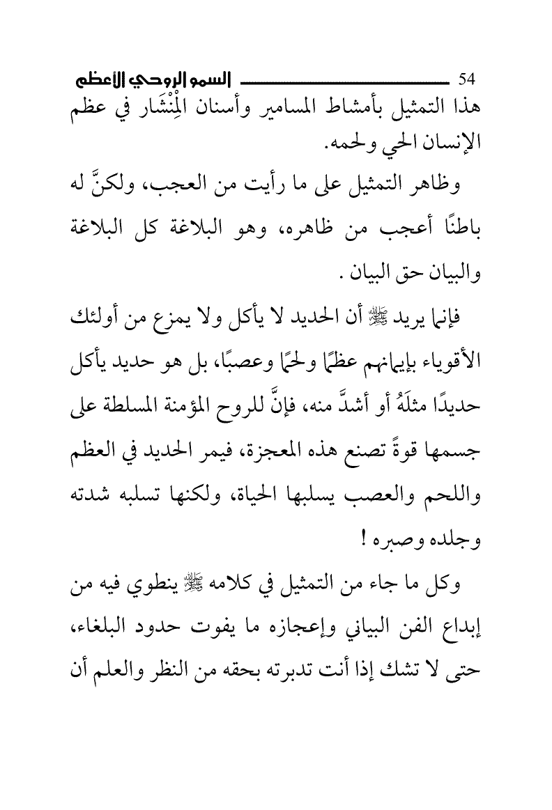 فإنما يريد - صلى الله عليه وسلم - أن الحديد لا يأكل ولا يمزع من أولئك الأقوياء بإيمانهم عظمًا ولحمًا وعصبًا، بل هو حديد يأكل حديدًا مثلَهُ أو أشدَّ منه، فإنَّ للروح المؤمنة المسلطة على جسمها قوةً تصنع هذه المعجزة، فيمر الحديد في العظم واللحم والعصب يسلبها الحياة، ولكنها تسلبه شدته وجلده وصبره!