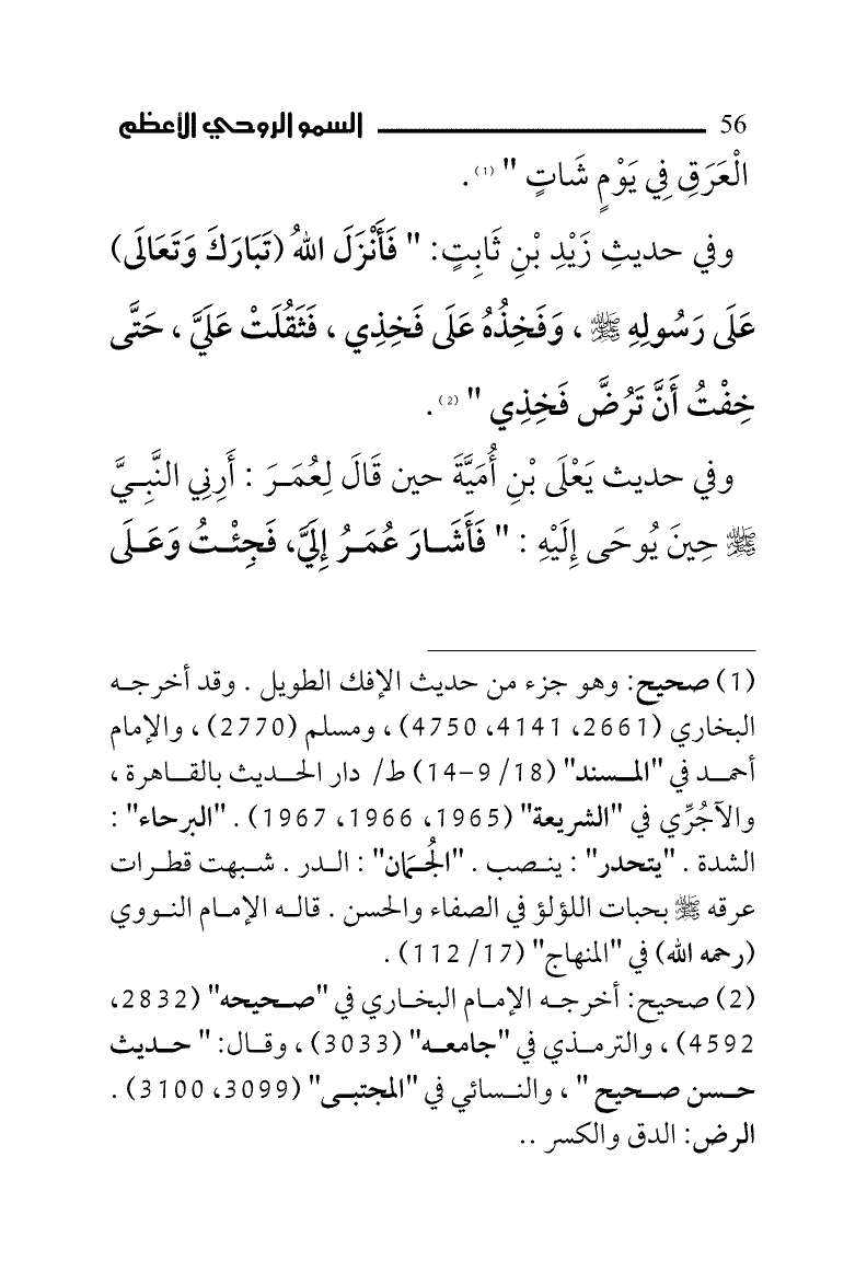 (¬1) صحيح: وهو جزء من حديث الإفك الطويل. وقد أخرجه البخاري (2661، 4141، 4750)، ومسلم (2770)، والإمام أحمد في "المسند" (18/ 9 - 14) ط/ دار الحديث بالقاهرة، والآجُرِّي في "الشريعة" (1965، 1966، 1967). "البرحاء": الشدة. "يتحدر": ينصب. "الجُمَان": الدر. شبهت قطرات عرقه - صلى الله عليه وسلم - بحبات اللؤلؤ في الصفاء والحسن. قاله الإمام النووي (رحمه الله) في "المنهاج" (17/ 112).