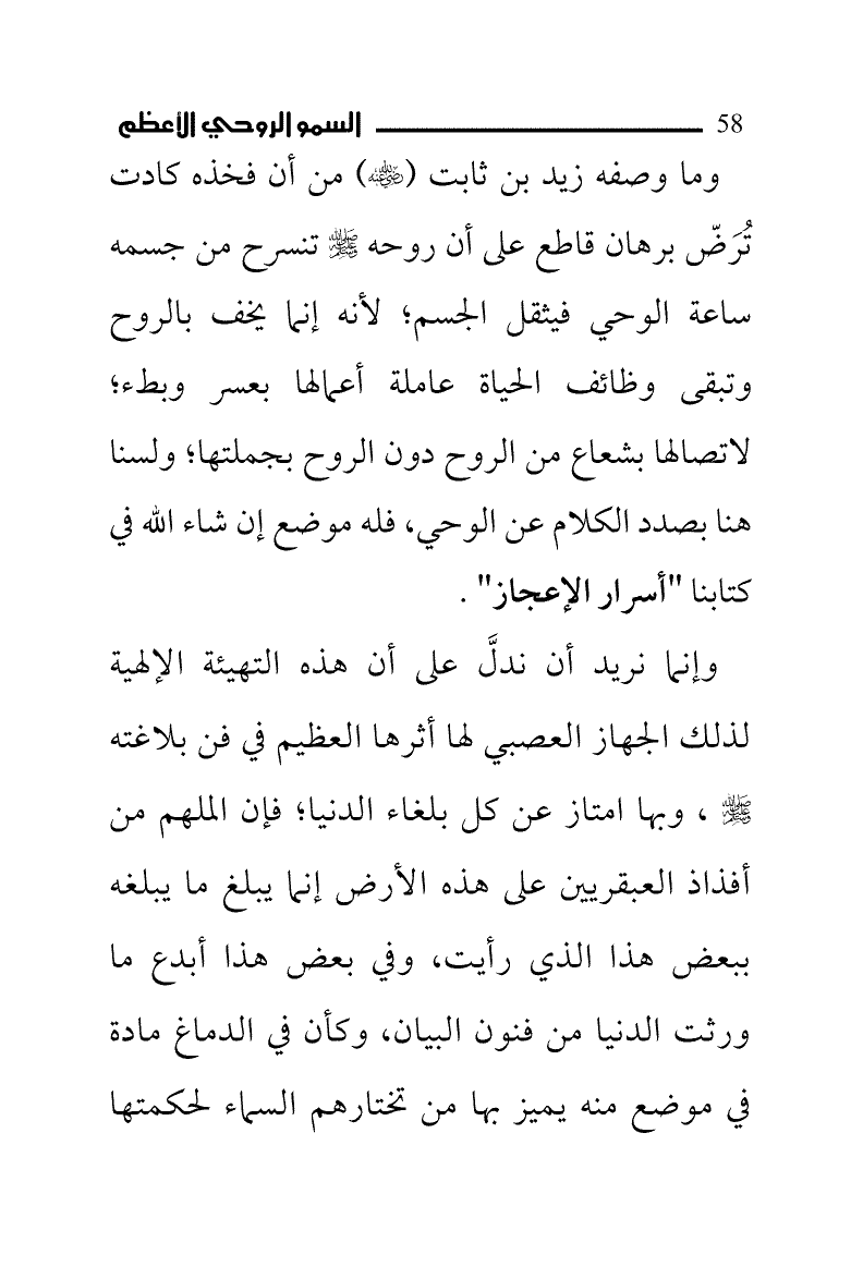 وما وصفه زيد بن ثابت (رضي الله عنه) من أن فخذه كادت تُرَضّ برهان قاطع على أن روحه - صلى الله عليه وسلم - تنسرح من جسمه ساعة الوحي فيثقل الجسم؛ لأنه إنما يخف بالروح وتبقى وظائف الحياة عاملة أعمالها بعسر وبطء؛ لاتصالها بشعاع من الروح دون الروح بجملتها؛ ولسنا هنا بصدد الكلام عن الوحي، فله موضع إن شاء الله في كتابنا "أسرار الإعجاز" (¬1).