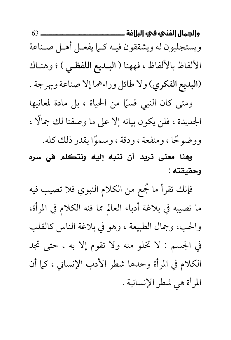 فإنك تقرأ ما جُمع من الكلام النبوي فلا تصيب فيه ما تصيبه في بلاغة أدباء العالم مما فنه الكلام في المرأة، والحب، وجمال الطبيعة، وهو في بلاغة الناس كالقلب في الجسم: لا تخلو منه ولا تقوم إلا به، حتى تجد الكلام في المرأة وحدها شطر الأدب الإنساني، كما أن المرأة هي شطر الإنسانية.