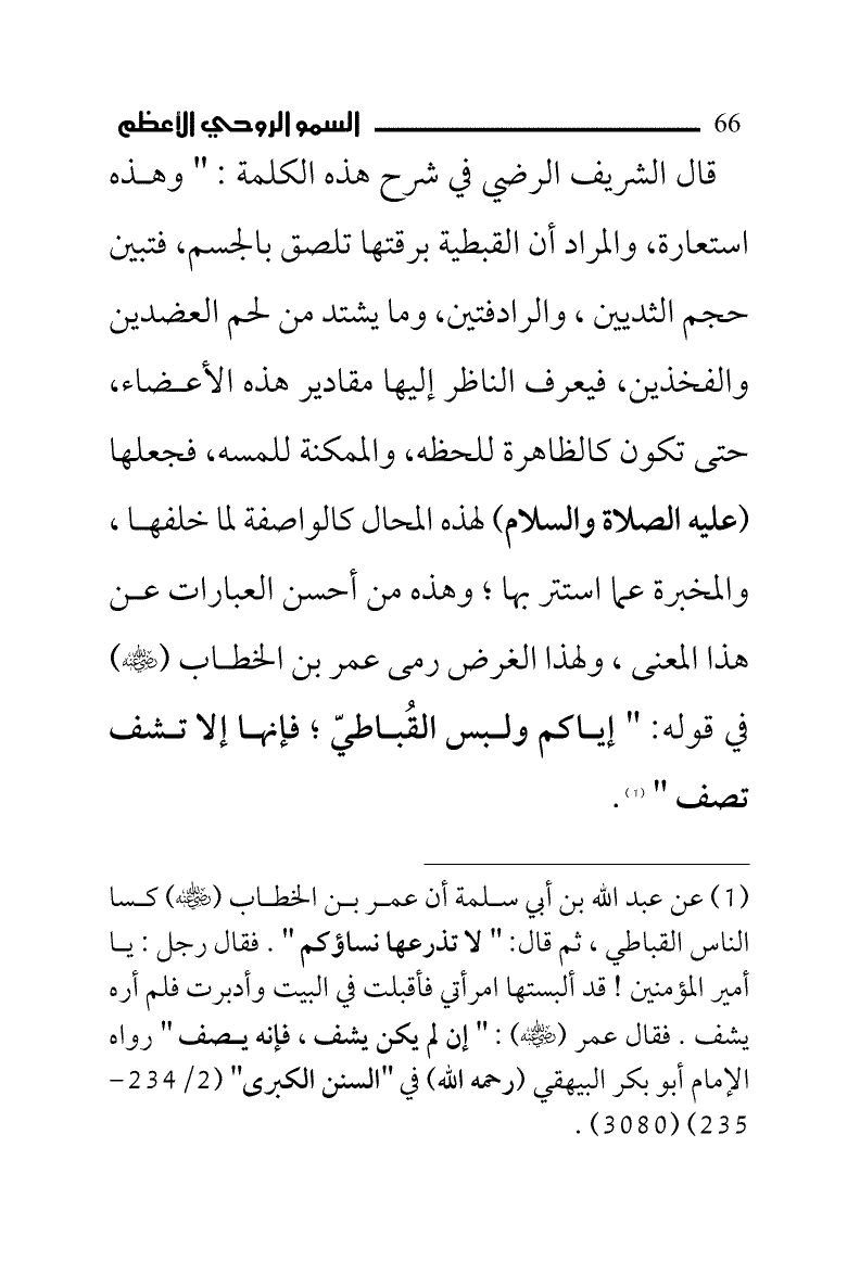 (¬1) عن عبد الله بن أبي سلمة أن عمر بن الخطاب (رضي الله عنه) كسا الناس القباطي، ثم قال: ((لا تذرعها نساؤكم)). فقال رجل: يا أمير المؤمنين! قد ألبستها امرأتي فأقبلت في البيت وأدبرت فلم أره يشف. فقال عمر (رضي الله عنه): ((إن لم يكن يشف، فإنه يصف)) رواه الإمام أبو بكر البيهقي (رحمه الله) في "السنن الكبرى" (2/ 234 - 235) (3080).