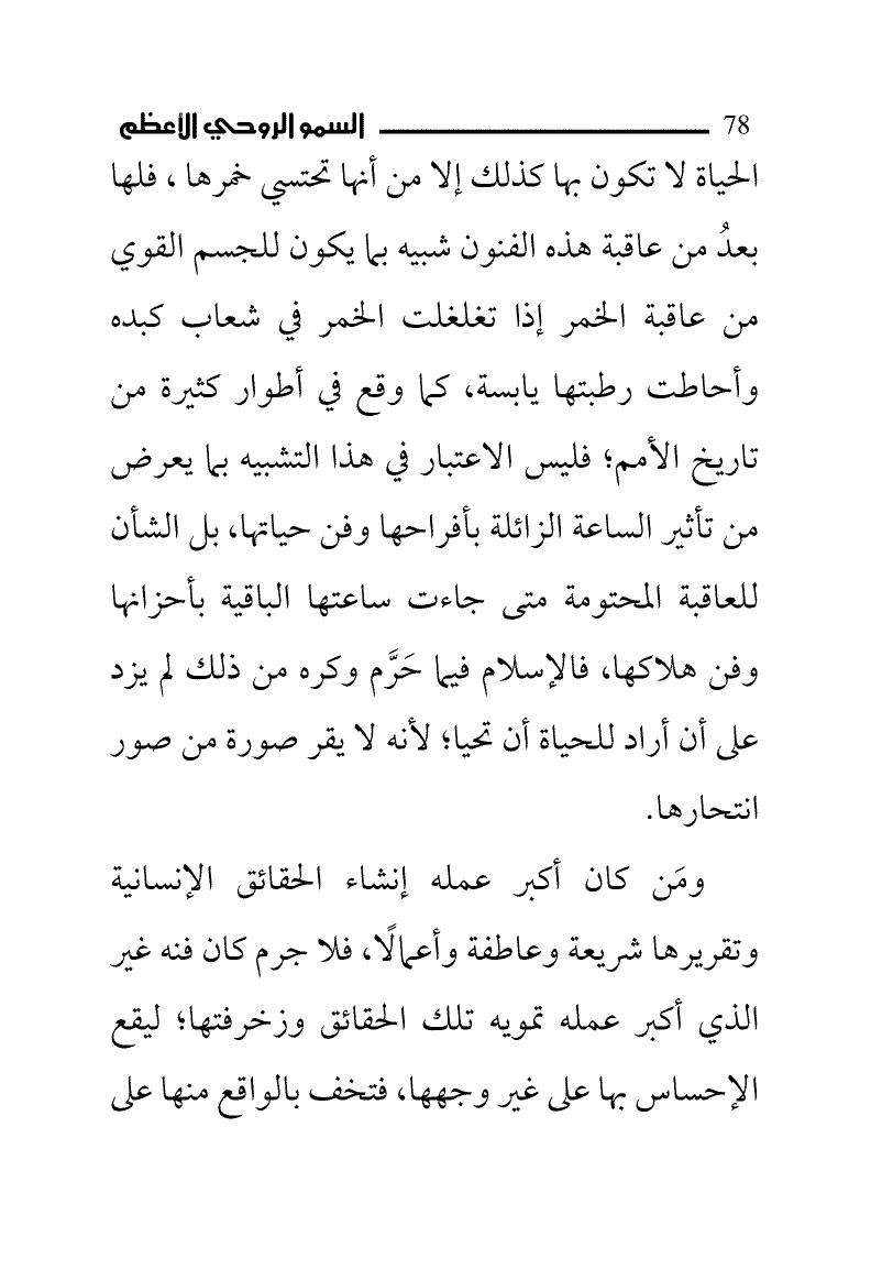الحياة لا تكون بها كذلك إلا من أنها تحتسي خمرها، فلها بعدُ من عاقبة هذه الفنون شبيه بما يكون للجسم القوي من عاقبة الخمر إذا تغلغلت الخمر في شعاب كبده وأحاطت رطبتها يابسة، كما وقع في أطوار كثيرة من تاريخ الأمم؛ فليس الاعتبار في هذا التشبيه بما يعرض من تأثير الساعة الزائلة بأفراحها وفن حياتها، بل الشأن للعاقبة المحتومة متى جاءت ساعتها الباقية بأحزانها وفن هلاكها، فالإسلام فيما حَرَّم وكره من ذلك لم يزد على أن أراد للحياة أن تحيا؛ لأنه لا يقر صورة من صور انتحارها.