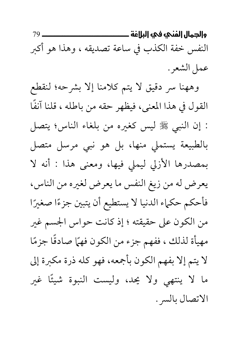 وههنا سر دقيق لا يتم كلامنا إلا بشرحه؛ لنقطع القول في هذا المعنى، فيظهر حقه من باطله، قلنا آنفًا: إن النبي - صلى الله عليه وسلم - ليس كغيره من بلغاء الناس؛ يتصل بالطبيعة يستملي منها، بل هو نبي مرسل متصل بمصدرها الأزلي ليملي فيها، ومعنى هذا: أنه لا يعرض له من زيغ النفس ما يعرض لغيره من الناس، فأحكم حكماء الدنيا لا يستطيع أن يتبين جزءًا صغيرًا من الكون على حقيقته؛ إذ كانت حواس الجسم غير مهيأة لذلك، ففهم جزء من الكون فهمًا صادقًا جزمًا لا يتم إلا بفهم الكون بأجمعه، فهو كله ذرة مكبرة إلى ما لا ينتهي ولا يحد، وليست النبوة شيئًا غير الاتصال بالسر.
