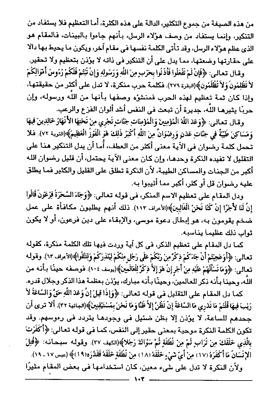 وقال تعالى: وَعَدَ اللَّهُ الْمُؤْمِنِينَ وَالْمُؤْمِناتِ جَنَّاتٍ تَجْرِي مِنْ تَحْتِهَا الْأَنْهارُ خالِدِينَ فِيها وَمَساكِنَ طَيِّبَةً فِي جَنَّاتِ عَدْنٍ وَرِضْوانٌ مِنَ اللَّهِ أَكْبَرُ ذلِكَ هُوَ الْفَوْزُ الْعَظِيمُ (التوبة 72). فلا تحمل كلمة رضوان في الآية معنى أكثر من العطف، أما أن يدل التنكير هنا على التقليل لا تفيده النكرة وحدها، وإن كان معنى الآية يحتمل، أن قليل رضوان الله أكبر من الجنات والمساكن الطيبة، لأن النكرة تطلق على القليل والكثير فما يطلق عليه رضوان قل أو كثر، أكبر مما أثيبوا به.