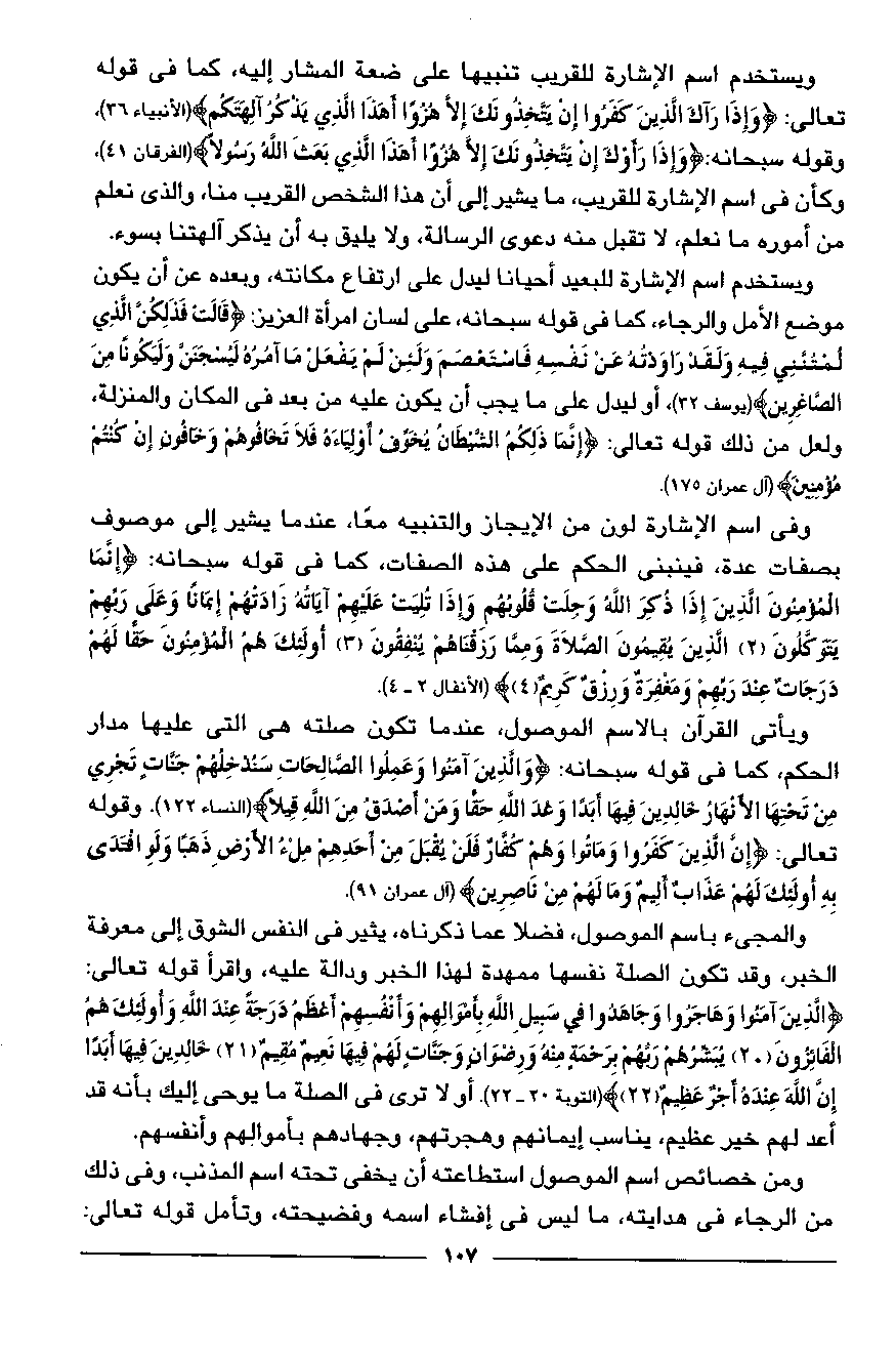 وفي اسم الإشارة لون من الإيجاز والتنبيه معا، عند ما يشير إلى موصوف بصفات عدة، فينبنى الحكم على هذه الصفات، كما في قوله سبحانه: إِنَّمَا الْمُؤْمِنُونَ الَّذِينَ إِذا ذُكِرَ اللَّهُ وَجِلَتْ قُلُوبُهُمْ وَإِذا تُلِيَتْ عَلَيْهِمْ آياتُهُ زادَتْهُمْ إِيماناً وَعَلى رَبِّهِمْ يَتَوَكَّلُونَ (2) الَّذِينَ يُقِيمُونَ الصَّلاةَ وَمِمَّا رَزَقْناهُمْ يُنْفِقُونَ (3) أُولئِكَ هُمُ الْمُؤْمِنُونَ حَقًّا لَهُمْ دَرَجاتٌ عِنْدَ رَبِّهِمْ وَمَغْفِرَةٌ وَرِزْقٌ كَرِيمٌ (4) (الأنفال 2 - 4).