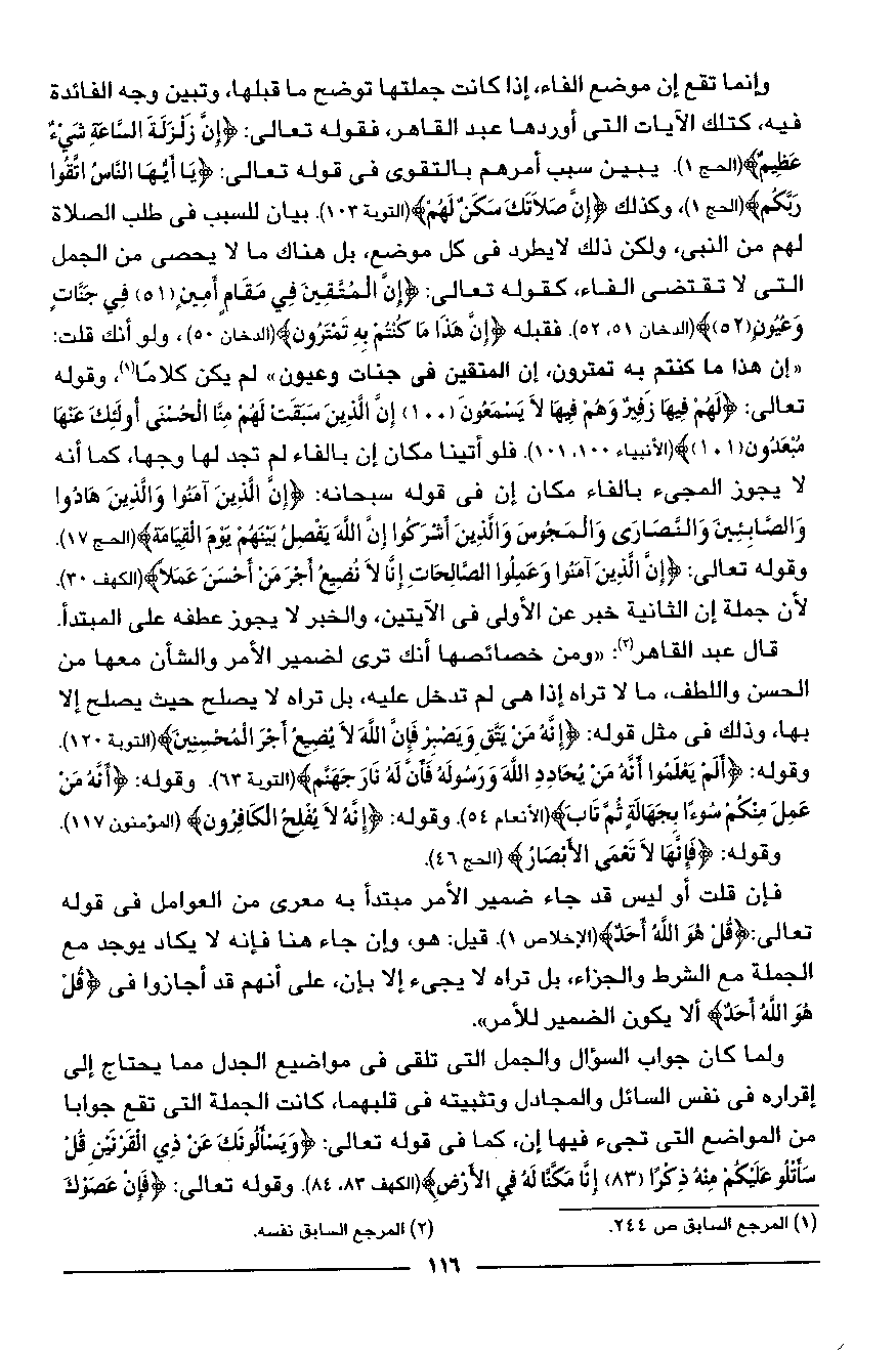«إن هذا ما كنتم به تمترون، إن المتقين في جنات وعيون» لم يكن كلاما (¬1)، وقوله تعالى: لَهُمْ فِيها زَفِيرٌ وَهُمْ فِيها لا يَسْمَعُونَ (100) إِنَّ الَّذِينَ سَبَقَتْ لَهُمْ مِنَّا الْحُسْنى أُولئِكَ عَنْها مُبْعَدُونَ (101) (الأنبياء 100، 101). فلو أتينا مكان إن بالفاء لم تجد لها وجها، كما أنه لا يجوز المجيء بالفاء مكان إن في قوله سبحانه: إِنَّ الَّذِينَ آمَنُوا وَالَّذِينَ هادُوا وَالصَّابِئِينَ وَالنَّصارى وَالْمَجُوسَ وَالَّذِينَ أَشْرَكُوا إِنَّ اللَّهَ يَفْصِلُ بَيْنَهُمْ يَوْمَ الْقِيامَةِ (الحج 17).