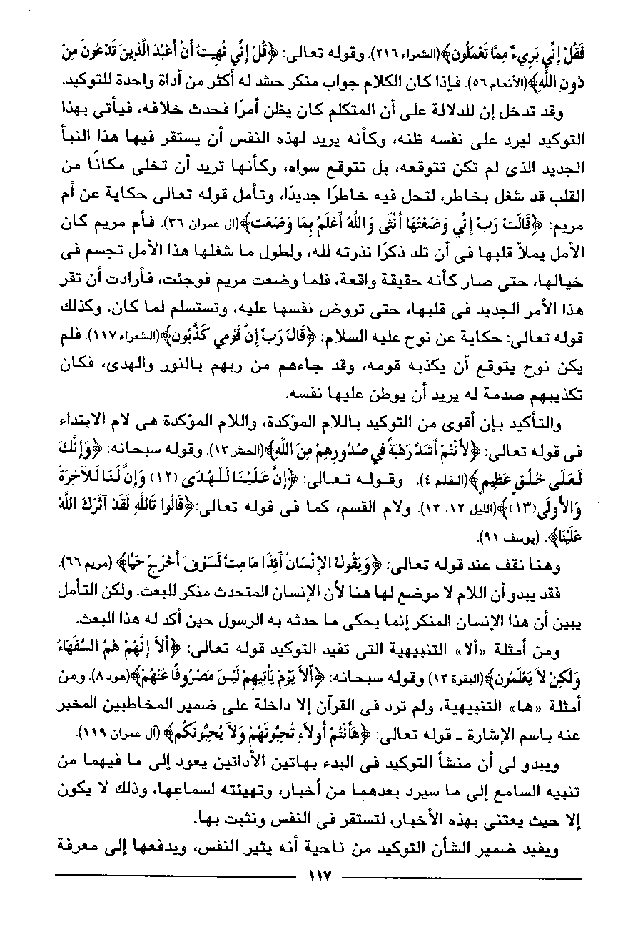فَقُلْ إِنِّي بَرِيءٌ مِمَّا تَعْمَلُونَ (الشعراء 216). وقوله تعالى: قُلْ إِنِّي نُهِيتُ أَنْ أَعْبُدَ الَّذِينَ تَدْعُونَ مِنْ دُونِ اللَّهِ (الأنعام 56). فإذا كان الكلام جواب منكر حشد له أكثر من أداة واحدة للتوكيد.