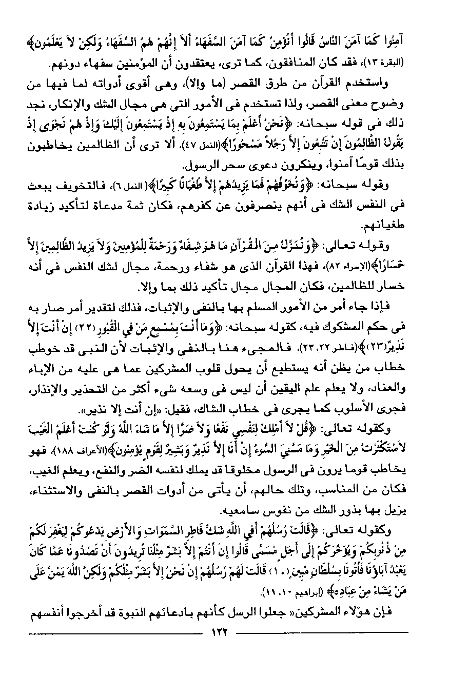 وكقوله تعالى: قُلْ لا أَمْلِكُ لِنَفْسِي نَفْعاً وَلا ضَرًّا إِلَّا ما شاءَ اللَّهُ وَلَوْ كُنْتُ أَعْلَمُ الْغَيْبَ لَاسْتَكْثَرْتُ مِنَ الْخَيْرِ وَما مَسَّنِيَ السُّوءُ إِنْ أَنَا إِلَّا نَذِيرٌ وَبَشِيرٌ لِقَوْمٍ يُؤْمِنُونَ (الأعراف 188)، فهو يخاطب قوما يرون في الرسول مخلوقا قد يملك لنفسه الضر والنفع، ويعلم الغيب، فكان من المناسب، وتلك حالهم، أن يأتى من أدوات القصر بالنفى والاستثناء، يزيل بها بذور الشك من نفوس سامعيه.