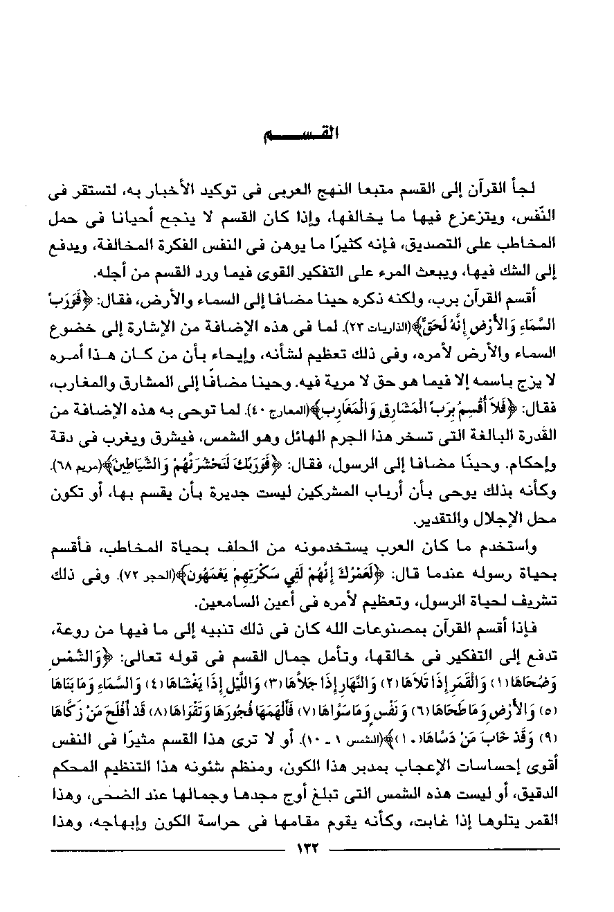 فإذا أقسم القرآن بمصنوعات الله كان في ذلك تنبيه إلى ما فيها من روعة، تدفع إلى التفكير في خالقها، وتأمل جمال القسم في قوله تعالى: وَالشَّمْسِ وَضُحاها (1) وَالْقَمَرِ إِذا تَلاها (2) وَالنَّهارِ إِذا جَلَّاها (3) وَاللَّيْلِ إِذا يَغْشاها (4) وَالسَّماءِ وَما بَناها (5) وَالْأَرْضِ وَما طَحاها (6) وَنَفْسٍ وَما سَوَّاها (7) فَأَلْهَمَها فُجُورَها وَتَقْواها (8) قَدْ أَفْلَحَ مَنْ زَكَّاها (9) وَقَدْ خابَ مَنْ دَسَّاها (10) (الشمس 1 - 10). أو لا ترى هذا القسم مثيرا في النفس أقوى إحساسات الإعجاب بمدبر هذا الكون، ومنظم شئونه هذا التنظيم المحكم الدقيق، أو ليست هذه الشمس التى تبلغ أوج مجدها وجمالها عند الضحى، وهذا القمر يتلوها إذا غابت، وكأنه يقوم مقامها في حراسة الكون وإبهاجه، وهذا