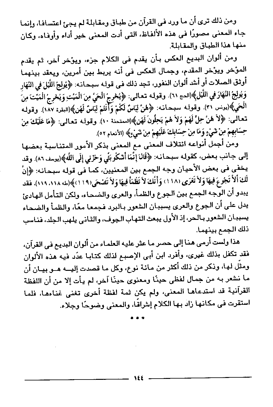 هذا ولست أرمى هنا إلى حصر ما عثر عليه العلماء من ألوان البديع في القرآن، فقد تكفل بذلك غيرى، وأفرد ابن أبى الإصبع لذلك كتابا عدّد فيه هذه الألوان ومثّل لها، وذكر من ذلك أكثر من مائة نوع، وكل ما قصدت إليه هو بيان أن ما نشعر به من جمال لفظى حينا ومعنوى حينا آخر، لم يأت إلا من أن اللفظة القرآنية قد استدعاها المعنى، ولم يكن ثمة لفظة أخرى تغنى غناءها، فلما استقرت في مكانها زاد بها الكلام إشراقا، والمعنى وضوحا وجلاء.