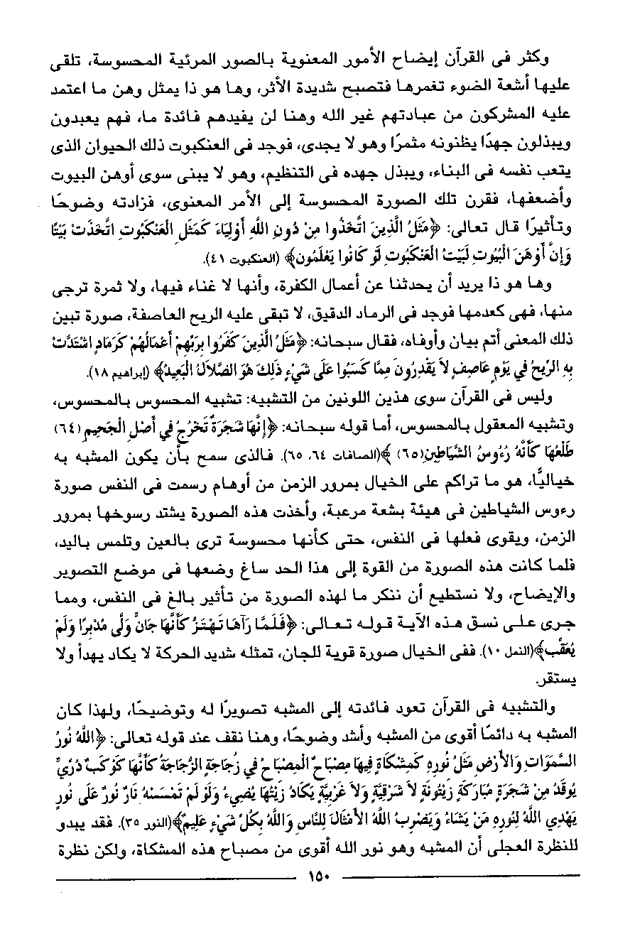 والتشبيه في القرآن تعود فائدته إلى المشبه تصويرا له وتوضيحا، ولهذا كان المشبه به دائما أقوى من المشبه وأشد وضوحا، وهنا نقف عند قوله تعالى: اللَّهُ نُورُ السَّماواتِ وَالْأَرْضِ مَثَلُ نُورِهِ كَمِشْكاةٍ فِيها مِصْباحٌ الْمِصْباحُ فِي زُجاجَةٍ الزُّجاجَةُ كَأَنَّها كَوْكَبٌ دُرِّيٌّ يُوقَدُ مِنْ شَجَرَةٍ مُبارَكَةٍ زَيْتُونَةٍ لا شَرْقِيَّةٍ وَلا غَرْبِيَّةٍ يَكادُ زَيْتُها يُضِيءُ وَلَوْ لَمْ تَمْسَسْهُ نارٌ نُورٌ عَلى نُورٍ يَهْدِي اللَّهُ لِنُورِهِ مَنْ يَشاءُ وَيَضْرِبُ اللَّهُ الْأَمْثالَ لِلنَّاسِ وَاللَّهُ بِكُلِّ شَيْءٍ عَلِيمٌ (النور 35). فقد يبدو للنظرة العجلى أن المشبه وهو نور الله أقوى من مصباح هذه المشكاة، ولكن نظرة