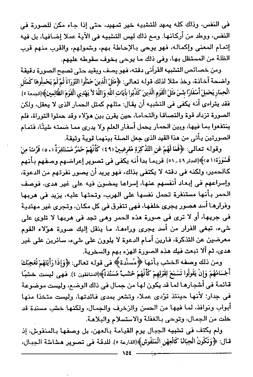 فقد يتراءى أنه يكفى في التشبيه أن يقال: مثلهم كمثل الحمار الذى لا يعقل، ولكن الصورة تزداد قوة والتصاقا والتحاما، حين يقرن بين هؤلاء وقد حملوا التوراة، فلم ينتفعوا بما فيها، وبين الحمار يحمل أسفار العلم ولا يدرى مما ضمته شيئا، فتمام الصورتين يأتى من هذا القيد الذى جعل الصلة بينهما قوية وثيقة.