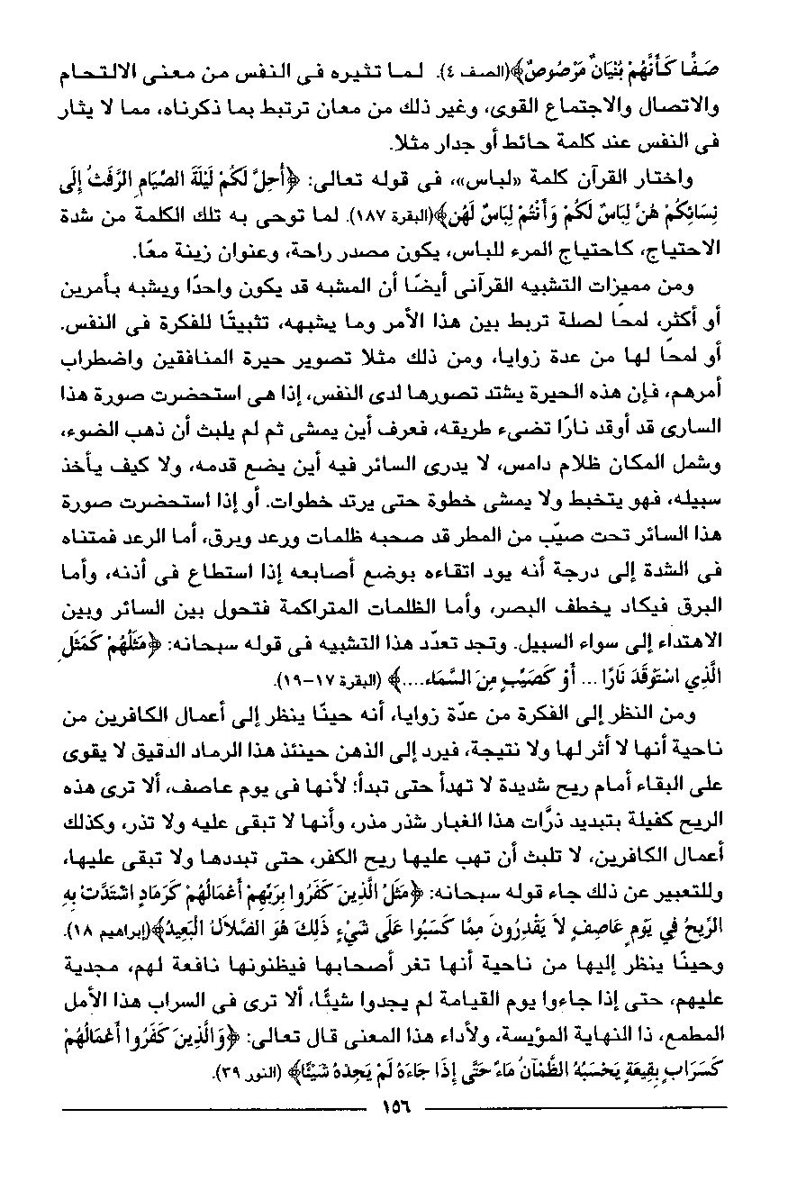 أو لمحا لها من عدة زوايا، ومن ذلك مثلا تصوير حيرة المنافقين واضطراب أمرهم، فإن هذه الحيرة يشتد تصورها لدى النفس، إذا هى استحضرت صورة هذا السارى قد أوقد نارا تضيء طريقه، فعرف أين يمشى ثمّ لم يلبث أن ذهب الضوء، وشمل المكان ظلام دامس، لا يدرى السائر فيه أين يضع قدمه، ولا كيف يأخذ سبيله، فهو يتخبط ولا يمشى خطوة حتى يرتد خطوات. أو إذا استحضرت صورة هذا السائر تحت صيّب من المطر قد صحبه ظلمات ورعد وبرق، أما الرعد فمتناه فى الشدة إلى درجة أنه يود اتقاءه بوضع أصابعه إذا استطاع في أذنه، وأما البرق فيكاد يخطف البصر، وأما الظلمات المتراكمة فتحول بين السائر وبين الاهتداء إلى سواء السبيل. وتجد تعدّد هذا التشبيه في قوله سبحانه: مَثَلُهُمْ كَمَثَلِ الَّذِي اسْتَوْقَدَ ناراً ... أَوْ كَصَيِّبٍ مِنَ السَّماءِ .... (البقرة 17 - 19).