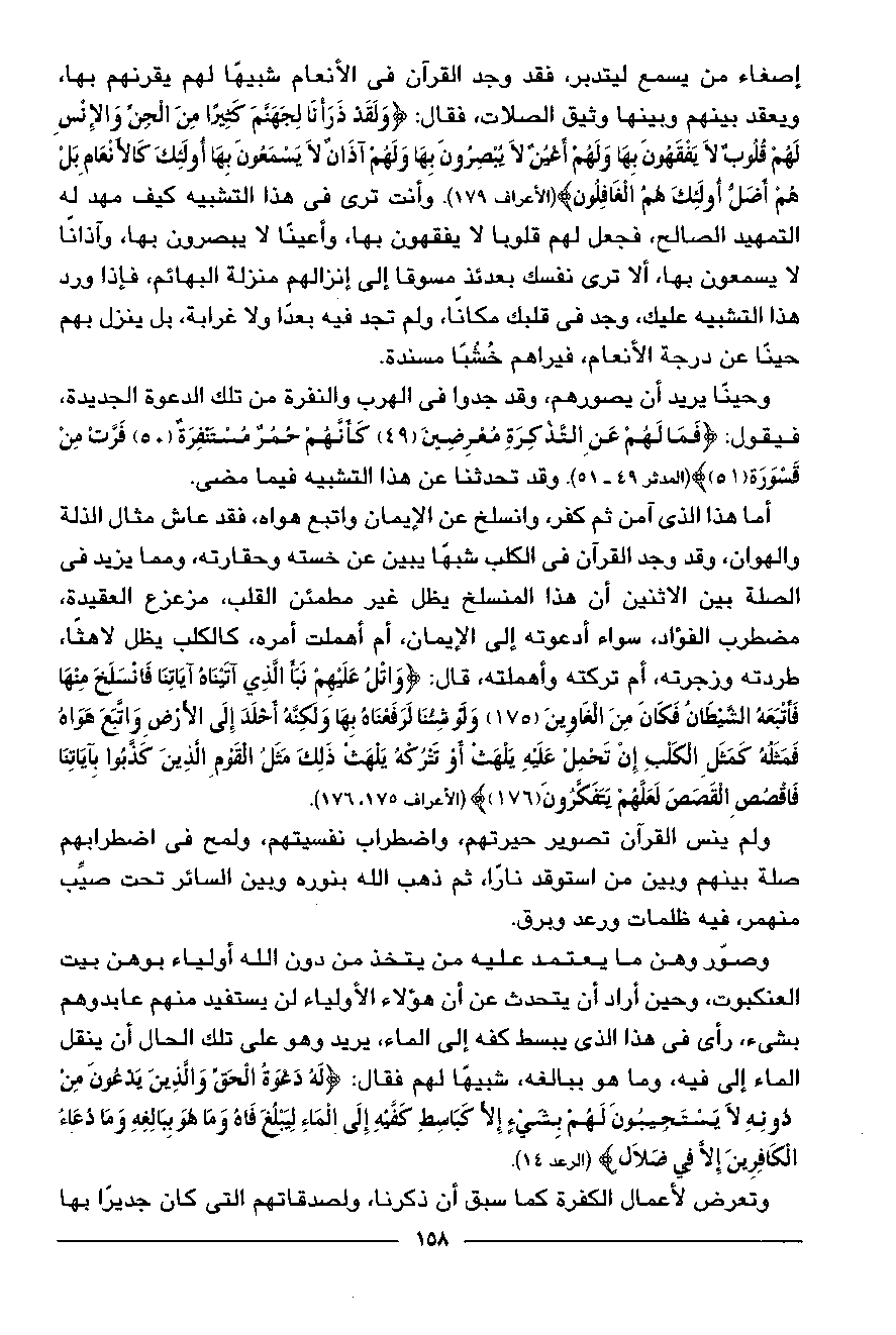 إصغاء من يسمع ليتدبر، فقد وجد القرآن في الأنعام شبيها لهم يقرنهم بها، ويعقد بينهم وبينها وثيق الصلات، فقال: وَلَقَدْ ذَرَأْنا لِجَهَنَّمَ كَثِيراً مِنَ الْجِنِّ وَالْإِنْسِ لَهُمْ قُلُوبٌ لا يَفْقَهُونَ بِها وَلَهُمْ أَعْيُنٌ لا يُبْصِرُونَ بِها وَلَهُمْ آذانٌ لا يَسْمَعُونَ بِها أُولئِكَ كَالْأَنْعامِ بَلْ هُمْ أَضَلُّ أُولئِكَ هُمُ الْغافِلُونَ (الأعراف 179). وأنت ترى في هذا التشبيه كيف مهد له التمهيد الصالح، فجعل لهم قلوبا لا يفقهون بها، وأعينا لا يبصرون بها، وآذانا لا يسمعون بها، ألا ترى نفسك بعدئذ مسوقا إلى إنزالهم منزلة البهائم، فإذا ورد هذا التشبيه عليك، وجد في قلبك مكانا، ولم تجد فيه بعدا ولا غرابة، بل ينزل بهم حينا عن درجة الأنعام، فيراهم خشبا مسندة.